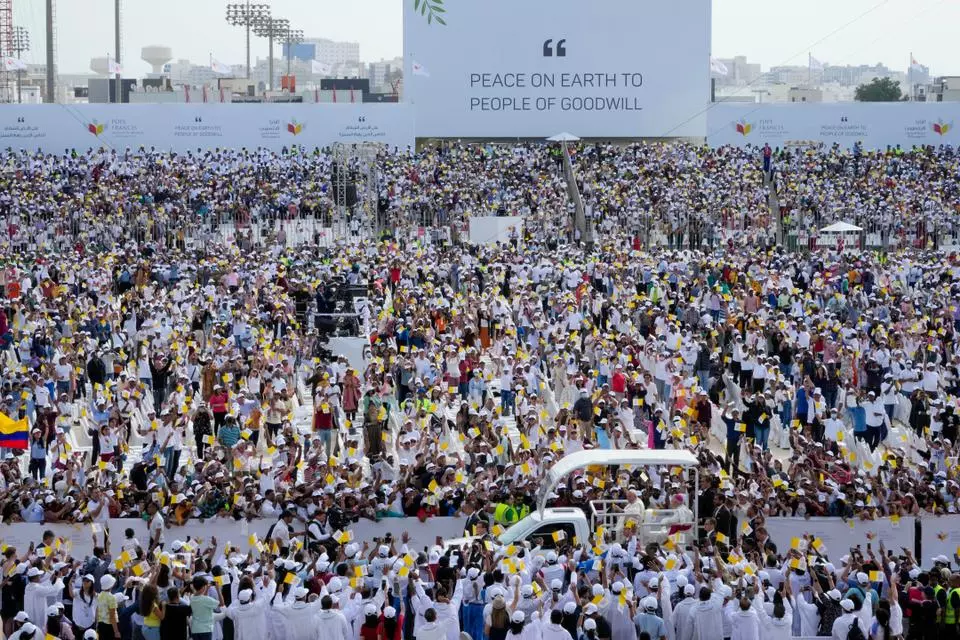 ബഹ്റൈനിലെ കത്തോലിക്കാ വിശ്വാസികൾക്ക് സ്വപ്ന സാക്ഷാൽക്കാരമായി ബഹ്റൈൻ നാഷണൽ സ്റ്റേഡിയത്തിൽ ഫ്രാൻസിസ് മാർപാപ്പയുടെ മുഖ്യകാർമ്മികത്വത്തിൽ വിശുദ്ധ കുർബാന അർപ്പിച്ചപ്പോൾ സ്റ്റേഡിയത്തിൽ നിറഞ്ഞുകവിഞ്ഞ് വിശ്വാസികൾ. രാവിലെ 8.15ഓടെയാണ് ഫ്രാൻസിസ് മാർപാപ്പ സ്റ്റേഡിയത്തിൽ എത്തിയത്. തുടർന്ന് പോപ്പ് മൊബീലിൽ സ്റ്റേഡിയത്തിനു വലംവെച്ച മാർപ്പാപ്പ വിശ്വാസികളെ അഭിസംബോധന ചെയ്തു. വിശ്വാസികൾക്കിടയിൽനിന്നു ഉയർത്തി നൽകിയ കുഞ്ഞുങ്ങൾക്ക് മാർപാപ്പ സ്നേഹ ചുംബനം നൽകി അനുഗ്രഹിച്ചു. ആരവങ്ങൾക്കിടയിലൂടെ തുറന്ന വാഹനത്തിൽ കൈവീശി കടന്നുപോയ മാർപാപ്പ വിവിധ ഭാഷക്കാരും ദേശക്കാരുമായ ആയിരങ്ങൾക്ക് സമ്മാനിച്ചത് സ്വപ്ന തുല്യമായ അസുലഭ മുഹൂർത്തം. മാർപാപ്പയുടെ ബഹ്റൈൻ സന്ദർശനത്തിന്റെ ലോഗോ പതിച്ച വെളുത്ത തൊപ്പിയണിഞ്ഞു പേപ്പൽ പതാക വീശിയാണ് വിശ്വാസികൾ മാർപാപ്പയെ എതിരേറ്റത്.