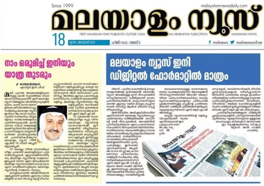 സൗദിയിൽ നിന്ന് പ്രസിദ്ധീകരിച്ചിരുന്ന 'മലയാളം ന്യൂസ്' ദിനപത്രം അച്ചടി നിർത്തി. ഇനി ഡിജിറ്റൽ ഫോർമാറ്റിലാകും പത്രം ജനങ്ങളിലേക്കെത്തുകയെന്ന് മലയാളം ന്യൂസ് എഡിറ്റർ ഇന്നത്തെ പത്രത്തിലൂടെ അറിയിച്ചു. 1999 ഏപ്രിൽ പതിനാറിനാണ് പത്രം അച്ചടി ആരംഭിച്ചിരുന്നത്. കാൽ നൂറ്റാണ്ടോളം കൂടെ നിന്ന വായനക്കാർക്ക് എഡിറ്റർ ഇൻ ചീഫ് താരീഖ് മിശ്ഖസ് നന്ദി അറിയിച്ചതായും പത്രം പറയുന്നു. വിവിധ ഡിജിറ്റൽ ഫോർമാറ്റുകളിൽ പത്രം പ്രവർത്തനം തുടരുമെന്നും ഇന്നിറക്കിയ പത്രത്തിലൂടെ മലയാളം ന്യൂസ് പറയുന്നു. വിതരണ, പ്രസിദ്ധീകരണ രംഗത്തെ ഭീമമായ ചിലവും പത്രങ്ങളിൽ നിന്നും വായനക്കാർ ഡിജിറ്റൽ ഫോർമാറ്റിലേക്ക് മാറിയതും പ്രസിദ്ധീകരണ രംഗത്ത് പ്രതിസന്ധി സൃഷ്ടിച്ചിട്ടുണ്ട്. ഇതോടെ നിലവിലുള്ള പത്രങ്ങൾ പലതും ഓൺലൈനിലേക്ക് മാറുകയാണ്. എസ് ആർ എം ജി ഗ്രൂപ്പിന് കീഴിലായിരുന്നു മലയാളം ന്യൂസ് പ്രസിദ്ധീകരിച്ചിരുന്നത്.