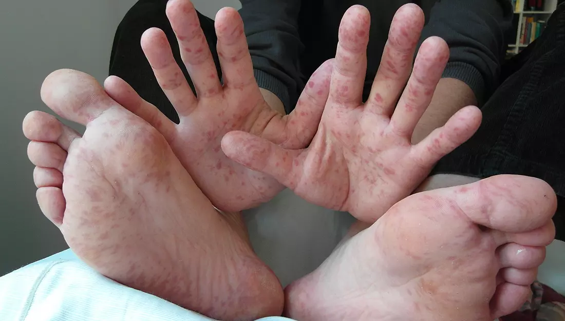 പനി, ക്ഷീണം, സന്ധിവേദന, കൈവെള്ളയിലും കാൽവെള്ളയിലും വായ്ക്കകത്തും പൃഷ്ഠഭാഗത്തും കൈകാൽമുട്ടുകളുടെ ഭാഗത്തും ചുവന്ന കുരുക്കളും തടിപ്പുകളും എന്നിവയാണ് പ്രധാന രോഗലക്ഷണങ്ങൾ. വയറുവേദന, ഓക്കാനം, ഛർദ്ദി, വയറിളക്കം എന്നിവയും ഉണ്ടാകാം. ശക്തമായ തുടർച്ചയായ പനി, കഠിനമായ ക്ഷീണം, അസ്വസ്ഥത, കൈകാലുകളിലെ രക്തചംക്രമണത്തിനു തടസം എന്നീ ലക്ഷണങ്ങൾ കാണിച്ചാൽ ഉടൻ ഡോക്ടറുടെ സേവനം ലഭ്യമാക്കുക.
