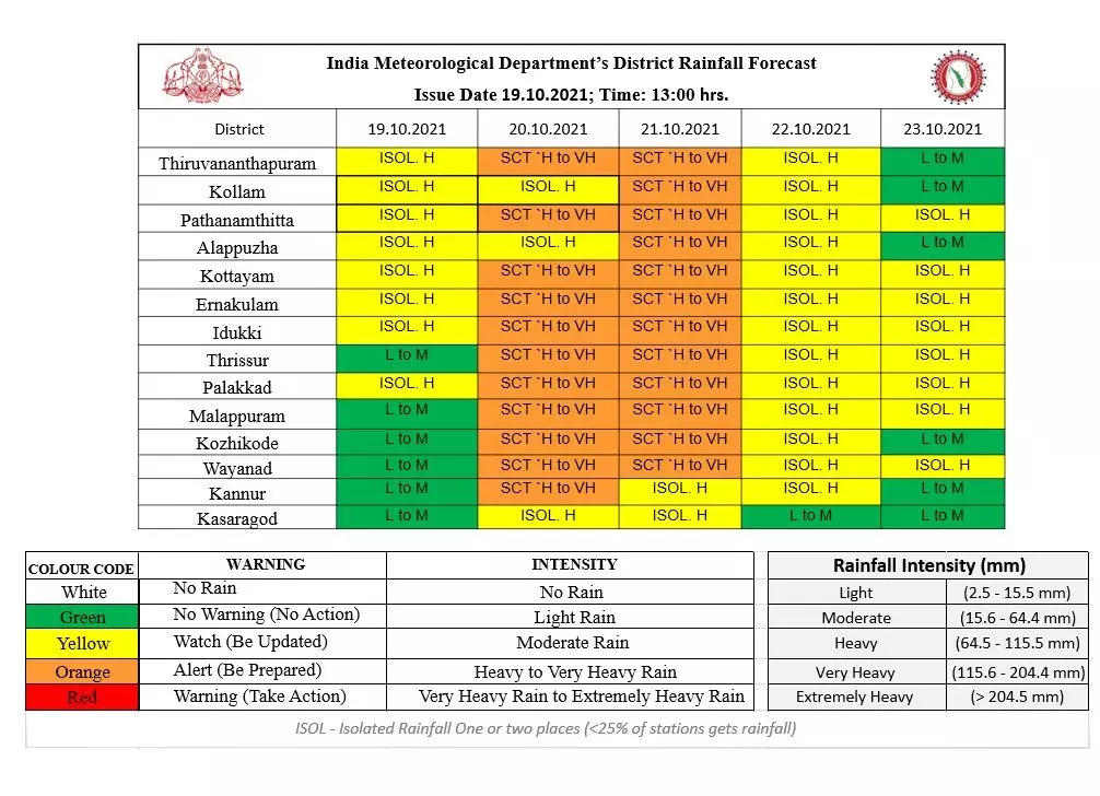 ഒക്ടോബർ 20 ന് തിരുവനന്തപുരം, പത്തനംതിട്ട, കോട്ടയം, എറണാകുളം, ഇടുക്കി, തൃശൂർ, പാലക്കാട്, മലപ്പുറം, കോഴിക്കോട് വയനാട്, കണ്ണൂർ എന്നീ ജില്ലകളിലും ഒക്ടോബർ 21 ന് കണ്ണൂർ, കാസർകോട് ജില്ലകൾ ഒഴികെ മുഴുവൻ ജില്ലകളിലും കേന്ദ്ര കാലാവസ്ഥ വകുപ്പ് ഓറഞ്ച് അലേർട്ട് പ്രഖ്യാപിച്ചിട്ടുണ്ട്. ഒക്ടോബർ 20 മുതൽ 23 വരെ സംസ്ഥാനത്ത് വ്യാപകമായി അതിശക്തമായ മഴക്ക് സാധ്യതയുണ്ടെന്ന് കേന്ദ്ര കാലാവസ്ഥ വകുപ്പ് അറിയിച്ചിട്ടുണ്ടെന്നും മലയോര മേഖലയിലും നദിക്കരകളിലും താമസിക്കുന്നവർ അതീവ ജാഗ്രത പുലർത്തണമെന്നും മുഖ്യമന്ത്രി പിണറായി വിജയൻ അറിയിച്ചിട്ടുണ്ട്.
