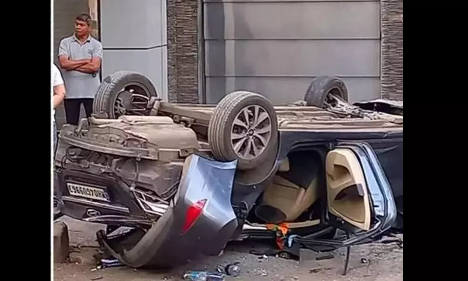 കെട്ടിടത്തിന്റെ സെക്യൂരിറ്റി ഗാർഡ് സ്ഥിരമായി ഇരിക്കുന്ന സ്ഥലത്തിനും താഴെ പാർക്ക് ചെയ്തിരുന്ന എസ്.യു.വിക്കും ഇടയിലാണ് കാർ പതിച്ചത്