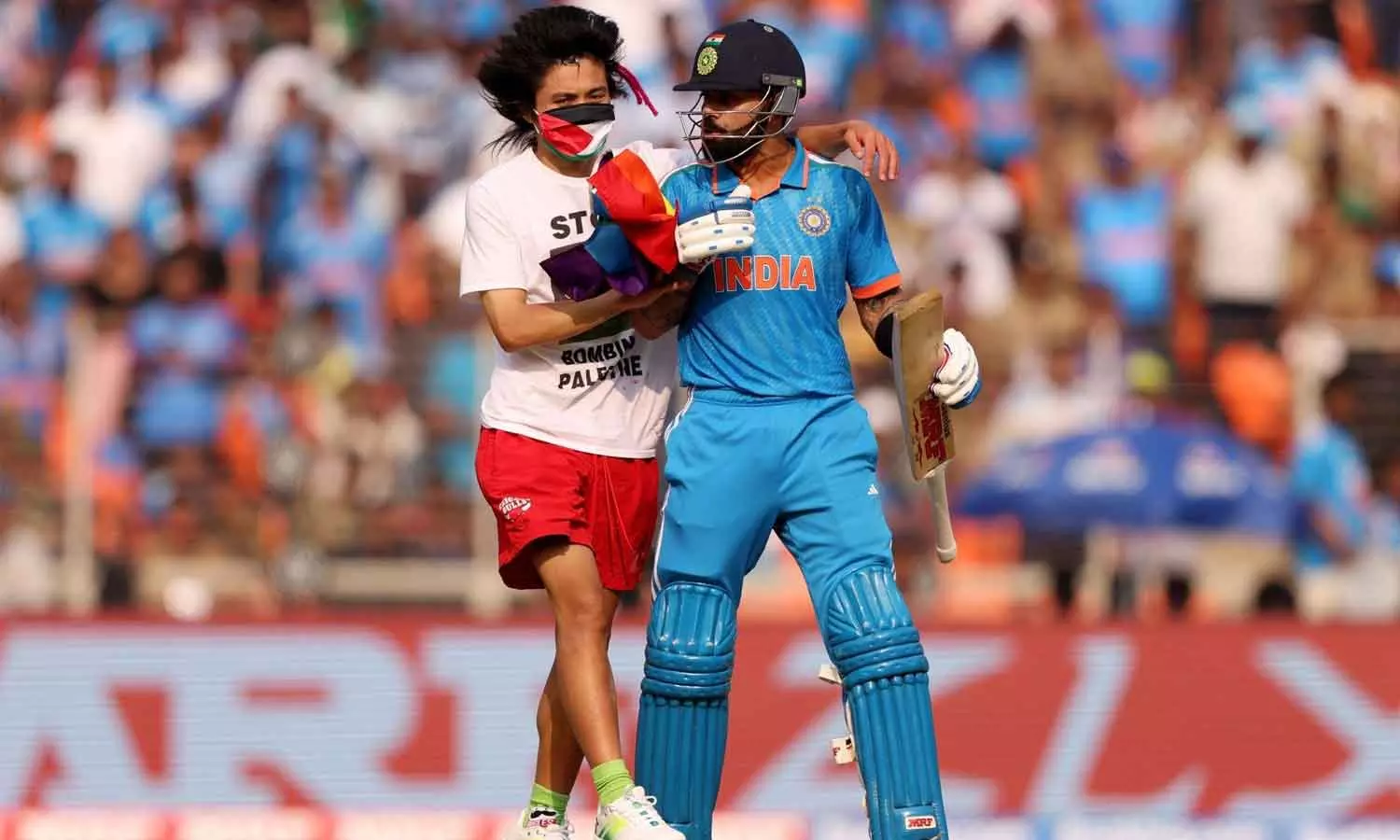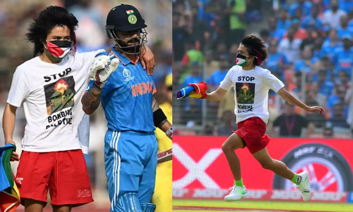 ഫലസ്തീൻ പതാക മാസ്കായി മുഖത്തണിഞ്ഞും 'ഫലസ്തീനെ സ്വതന്ത്രമാക്കുക', 'ഫലസ്തീന് മേലുള്ള ബോംബാക്രമണം അവസാനിപ്പിക്കുക' എന്നിങ്ങനെ എഴുതിയ ടീ ഷർട്ട് ധരിച്ചുമാണ് യുവാവ് ഗ്രൗണ്ടിലിറങ്ങിയത്. ഇയാളുടെ കൈയിൽ എൽ.ജി.ബി.ടി.ക്യു കൊടിയുമുണ്ടായിരുന്നു.