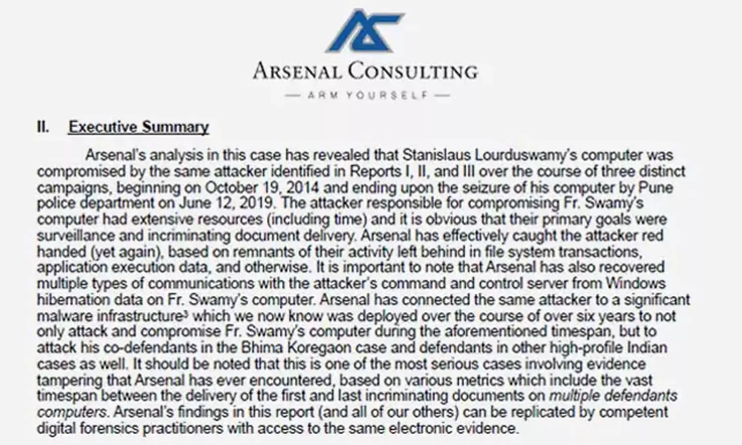 തീവ്രവാദ ബന്ധമാരോപിച്ച് 2020ൽ സ്റ്റാൻ സ്വാമിയെ അറസ്റ്റ് ചെയ്തിരുന്നു. തുടർന്ന് കസ്റ്റഡിയിലിരിക്കെ സ്റ്റാൻ സ്വാമി മരിച്ചു. എന്നാല് സ്റ്റാൻ സ്വാമിയുടെ അഭിഭാഷകർ ആഴ്സണൽ കൺസൾട്ടിംഗിനെ അന്വേഷണത്തിനായി സമീപിക്കുകയായിരുന്നു.