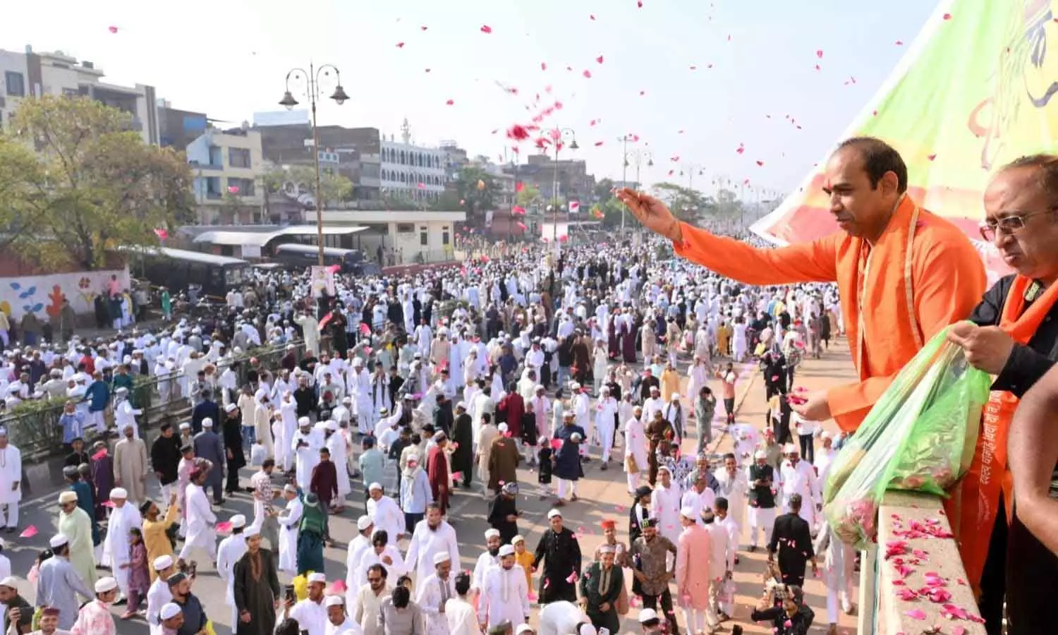 ഹിന്ദു-മുസ്ലിം ഏകതാ സമിതിയുടെ നേതൃത്വത്തിലായിരുന്നു പുഷ്പവൃഷ്ടി. പുലർച്ചെ മുതൽ തന്നെ ആയിരക്കണക്കിന് വിശ്വസികളാണ് പ്രാർത്ഥനയ്ക്കായി ജയ്പൂരിലെ ഈദ് ഗാഹിനെത്തിയത്.