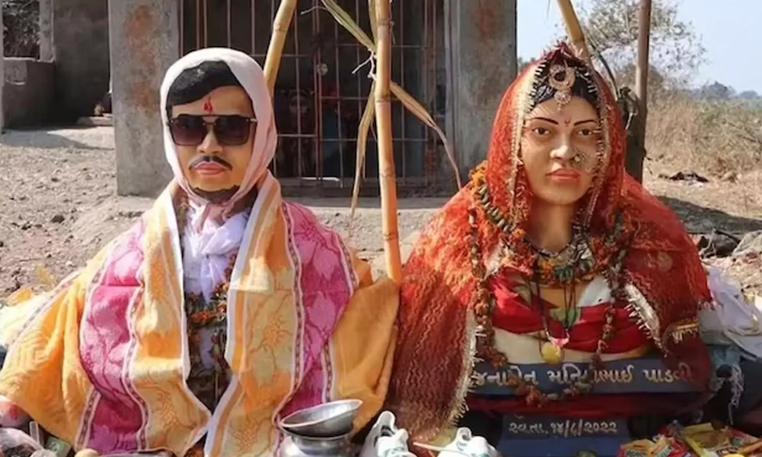 വിവാഹത്തിന് വീട്ടുകാർ സമ്മതം നൽകാത്തതിനെ തുടർന്ന് കഴിഞ്ഞ വർഷമാണ് നെവാല ഗ്രാമവാസികളായ ഗണേശ് പഡ്വിയും രഞ്ജന പഡ്വിയും ജീവനൊടുക്കുന്നത്. വിവാഹത്തിനുള്ള എതിർപ്പ് കൂടാതെ ഇരുകൂട്ടരുടെയും കുത്തുവാക്കുകൾ കൂടിയായപ്പോൾ സങ്കടം സഹിക്ക വയ്യാതെ ഇരുവരും തൂങ്ങി മരിക്കുകയായിരുന്നു. എന്നാൽ ഇവരുടെ മരണത്തിന് പിന്നാലെ കുറ്റബോധത്തിലായ വീട്ടുകാർ ഇരുവരുടെയും ആഗ്രഹം നടത്തിക്കൊടുക്കാൻ തീരുമാനിച്ചു. അങ്ങനെയാണ് ഇരുവരുടെയും പ്രതിമകൾ നിർമിക്കുന്നതും വിവാഹം നടത്തുന്നതും. ഗോത്രാചാരവിധി പ്രകാരം എല്ലാ ചടങ്ങുകളോടും കൂടിയായിരുന്നു വിവാഹം.