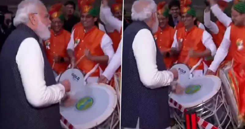 #WATCH PM Modi plays the drums along with members of the Indian community gathered to bid him goodbye before his departure for India from Glasgow, Scotland