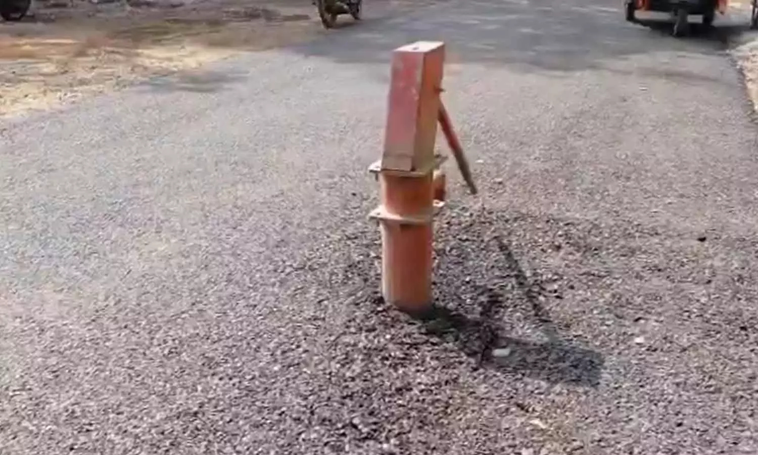 പൊതുജനങ്ങൾക്ക് വെള്ളമെടുക്കാനുള്ള ഹാൻഡ് പമ്പ് റോഡിന് നടുവിൽ; ഉത്തർപ്രദേശിലെ റോഡ് നിർമാണം ചർച്ചയാകുന്നു