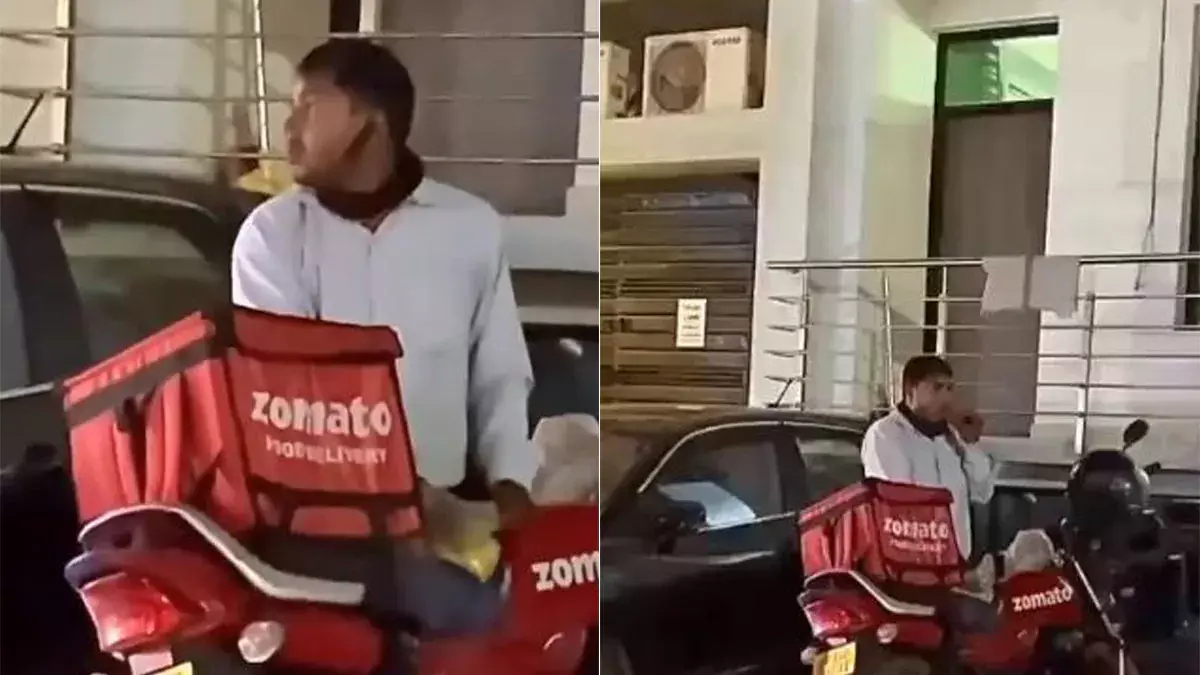 ഉപഭോക്താവിന് ഭക്ഷണം എത്തിച്ചശേഷം കൊണ്ടുവന്ന ഭക്ഷണം നിന്നുകൊണ്ട് കഴിച്ചു തീര്ക്കുകയാണ് സൊമാറ്റോയുടെ ഡെലിവറി ബോയ്