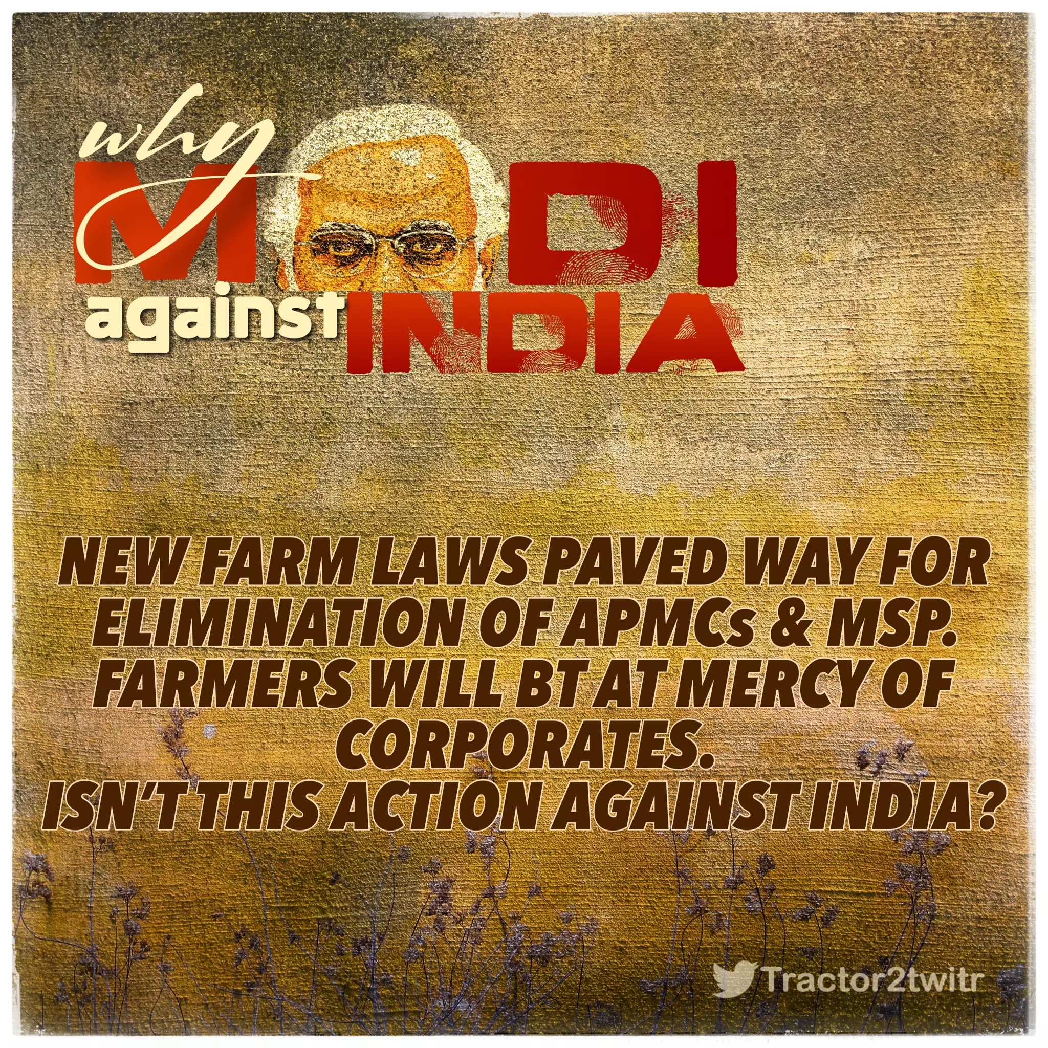 കാർഷകരെ കുത്തകകൾക്ക് ചൂഷണം ചെയ്യാൻ അവസരം ഒരുക്കുന്ന നിയമം എന്ത്കൊണ്ട് നിർമിച്ചുവെന്നും ഉത്പന്നങ്ങൾ മെച്ചപ്പെട്ട വില ലഭിക്കാൻ സഹായിക്കുന്ന എ.പി.എം.സികളെയും എം.എസ്.പികളെയും എന്തിന് അപ്രസക്തമാക്കുന്നുവെന്നും ട്വിറ്റർ പ്രതിഷേധകർ ചോദിക്കുന്നു. വ്യത്യസ്ത മതവിഭാഗങ്ങളിൽപ്പെട്ട ജനങ്ങൾ ഒത്തൊരുമയോടെ ജീവിക്കുന്നത് നിങ്ങൾ ഭയക്കുന്നതെന്തിനെന്നും എന്തിന് ഭിന്നിപ്പ് സൃഷ്ടിക്കുന്നുവെന്നും ചോദ്യം ഉയർത്തുന്നു. പെട്രോൾ, ഡീസൽ വിലയിൽവന്ന വൻ വർധനവും ഇടക്കാലത്ത് നൽകിയ ചെറിയ ഇളവും കാമ്പയിനിൽ ചർച്ചയാകുന്നു. മോദി അനുകൂല മാധ്യമങ്ങളും ട്വിറ്ററിൽ നിശിത വിമർശനമാണ് നേരിടുന്നത്.