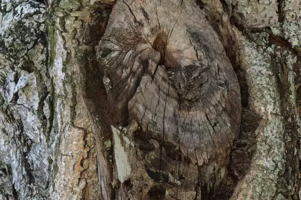 ചിറകുകള് ഒതുക്കിപ്പിടിച്ച് മരപ്പൊത്തിലിരിക്കുന്ന മൂങ്ങയുടെ ചിത്രമാണിത്. സൂക്ഷിച്ച് നോക്കിയാല് മാത്രമേ മൂങ്ങയുടെ രൂപം തെളിഞ്ഞു വരൂ. പകല് ശത്രുക്കളില് നിന്നും രക്ഷപ്പെടുന്നതിനും ഇരകളില് നിന്നും മറഞ്ഞിരിക്കുന്നതിനും മൂങ്ങയുടെ രൂപവും നിറവും ഏറെ സഹായിക്കുന്നുണ്ട്. ഫ്ളോറിഡയിലെ ഫോട്ടോഗ്രാഫറായ ലാറി ലിഞ്ചാണ് തന്റെ വീടിന് സമീപത്തു നിന്നും മൂങ്ങയുടെ ചിത്രം പകര്ത്തിയത്.