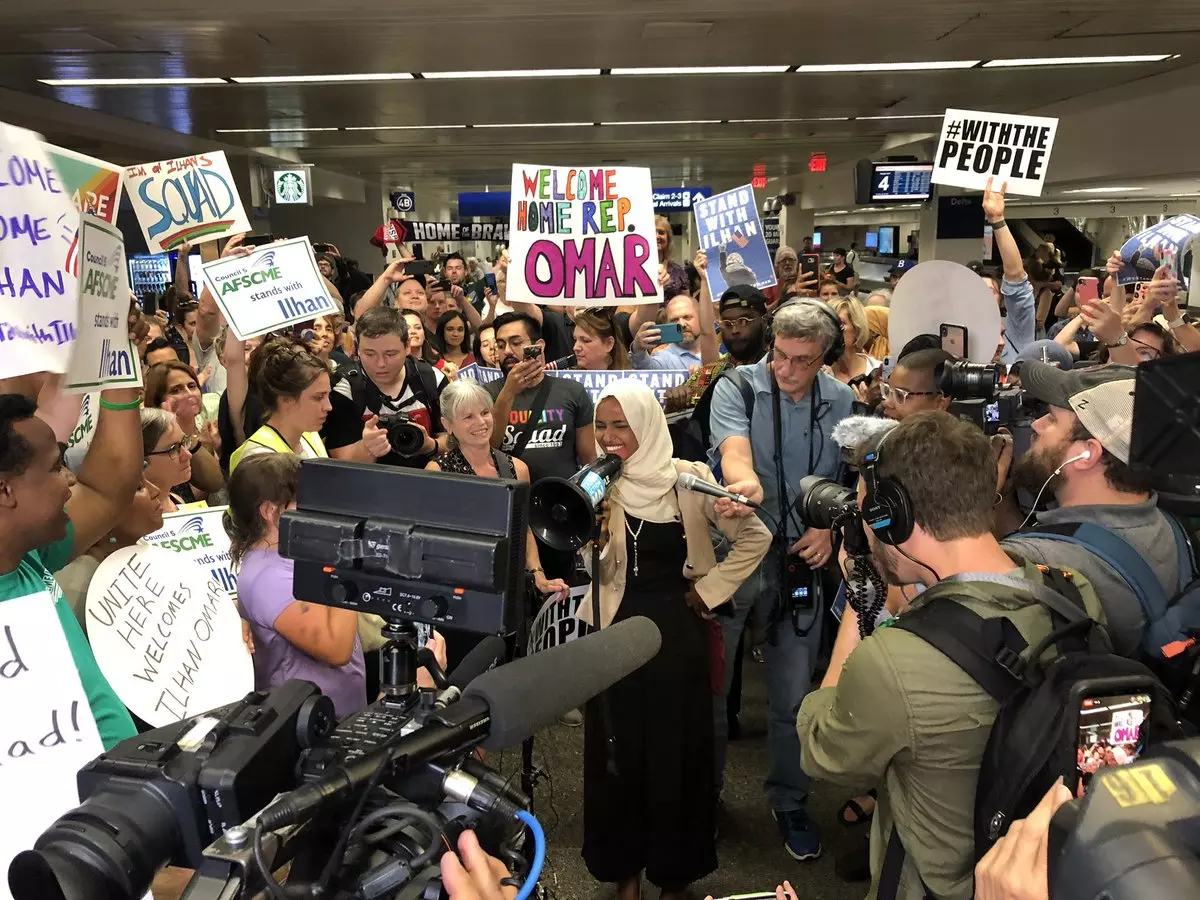 ഇൽഹാൻ ഉമറിന് മിനിയപൊലീസിലെ സെന്റ് പോൾ വിമാനത്താവളത്തിൽ ലഭിച്ച സ്വീകരണം