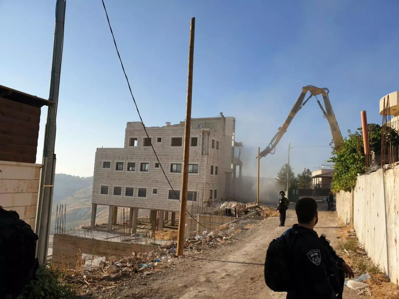 Ongoing: Demolitions in #SurBahir started early this morning with four houses at once. Preparations started past midnight as hundreds of armed Israeli occupying soldiers/ bulldozers stormed the town. Families threatened with demolitions were woken up/ moved out of their homes. pic.twitter.com/Xdu7tiJnGn
