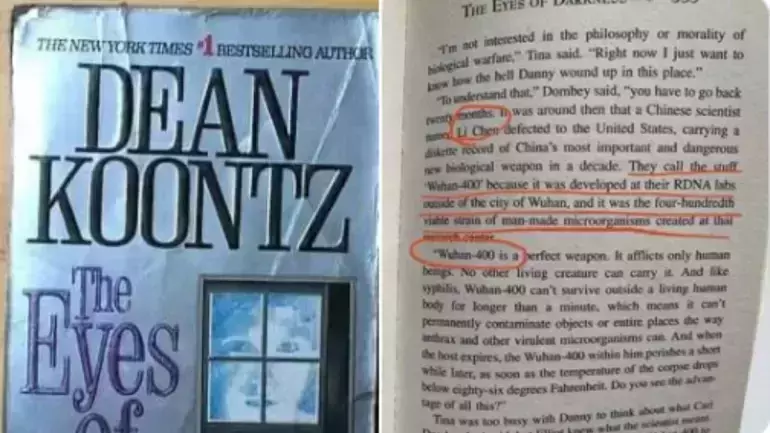 നാല്പത് വര്ഷം മുമ്പ് പുറത്തിറങ്ങിയ ദ ഐയ്സ് ഓഫ് ഡാര്ക്ക്നെസ് എന്ന ത്രില്ലര് നോവലാണ് താരം. വുഹാനില് നിന്നും പടര്ന്നു പിടിക്കുന്ന മഹാമാരിയെ കുറിച്ചുള്ള കഥയാണ് ദ ഐയ്സ് ഓഫ് ഡാര്ക്ക്നെസ് പറയുന്നത്. വുഹാന്-400 എന്നായിരുന്നു കഥയിലെ വൈറസിനിട്ട പേര്.