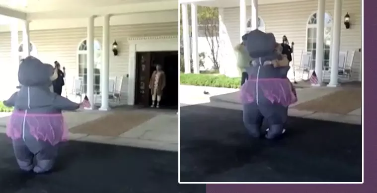 വെര്ജീനിയിയിലെ സ്റ്റിഫന്സ് സിറ്റിയിലെ നഴ്സിങ് സെന്ററിന് മുമ്പില് വെച്ച് ആരോ പകര്ത്തിയ വീഡിയോയാണ് ഇപ്പോള് വൈറലാകുന്നത്. ഹിപ്പോപ്പൊട്ടാമസിന്റെ വേഷത്തിനുള്ളില് കയറിയാണ് ഈ മകള് അമ്മയെ കാണാനെത്തിയത്.