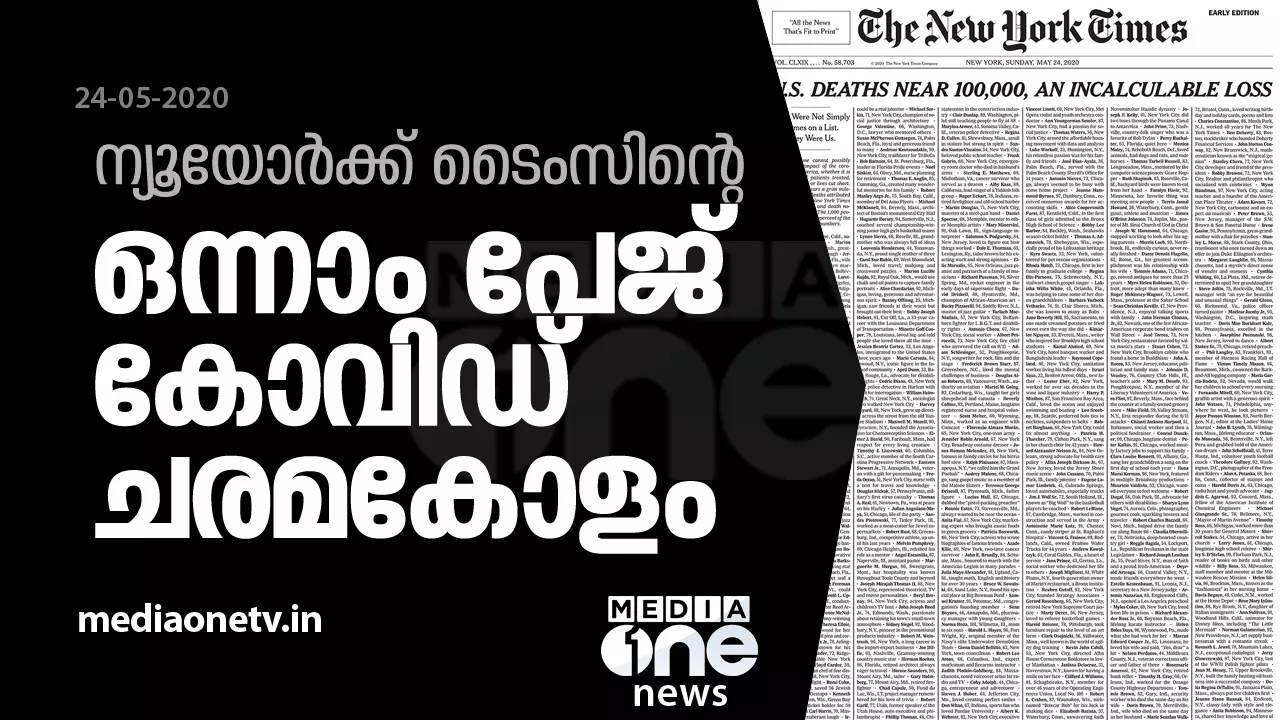 അമേരിക്കയിലെ കോവിഡ് ബാധയുടെ രൂക്ഷത വെളിവാക്കിക്കൊണ്ട് ഒന്നാം പേജ് ചരമക്കോളമാക്കി ദ ന്യൂയോര്ക്ക് ടൈംസ്. കോവിഡ് ബാധിച്ച് മരിച്ച ആയിരം പേരുടെ വിവരങ്ങളാണ് ഞായറാഴ്ച്ച പുറത്തിറങ്ങിയ ന്യൂയോര്ക്ക് ടൈംസിന്റെ ഒന്നാംപേജില് നിരത്തിയിരിക്കുന്നത്. അമേരിക്കയിലെ കോവിഡ് മരണം ഒരുലക്ഷത്തോട് അടുക്കുമ്പോഴാണ് ശക്തമായ ഭാഷയിലും വ്യത്യസ്തമായ അവതരണത്തിലും ന്യൂയോര്ക്ക് ടൈംസ് ജനങ്ങള്ക്ക് മുന്നിലെത്തിയത്.