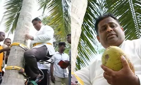 നാളികേരക്ഷാമത്തെ കുറിച്ച് ജനങ്ങളെ ബോധവത്കരിക്കാനായി തെങ്ങില് കയറി ശ്രീലങ്കയിലെ നാളികേര വകുപ്പ് മന്ത്രി അരുന്ധിക ഫെര്ണാണ്ടസ്. പ്രാദേശിക വ്യവസായങ്ങളുടെ ഉയർന്ന ഡിമാൻഡും ഗാർഹിക ഉപഭോഗവും മൂലം രാജ്യം നിലവില് 700 ദശലക്ഷം നാളികേരത്തിന്റെ കുറവ് നേരിടുന്നതായും മന്ത്രി പറഞ്ഞു.