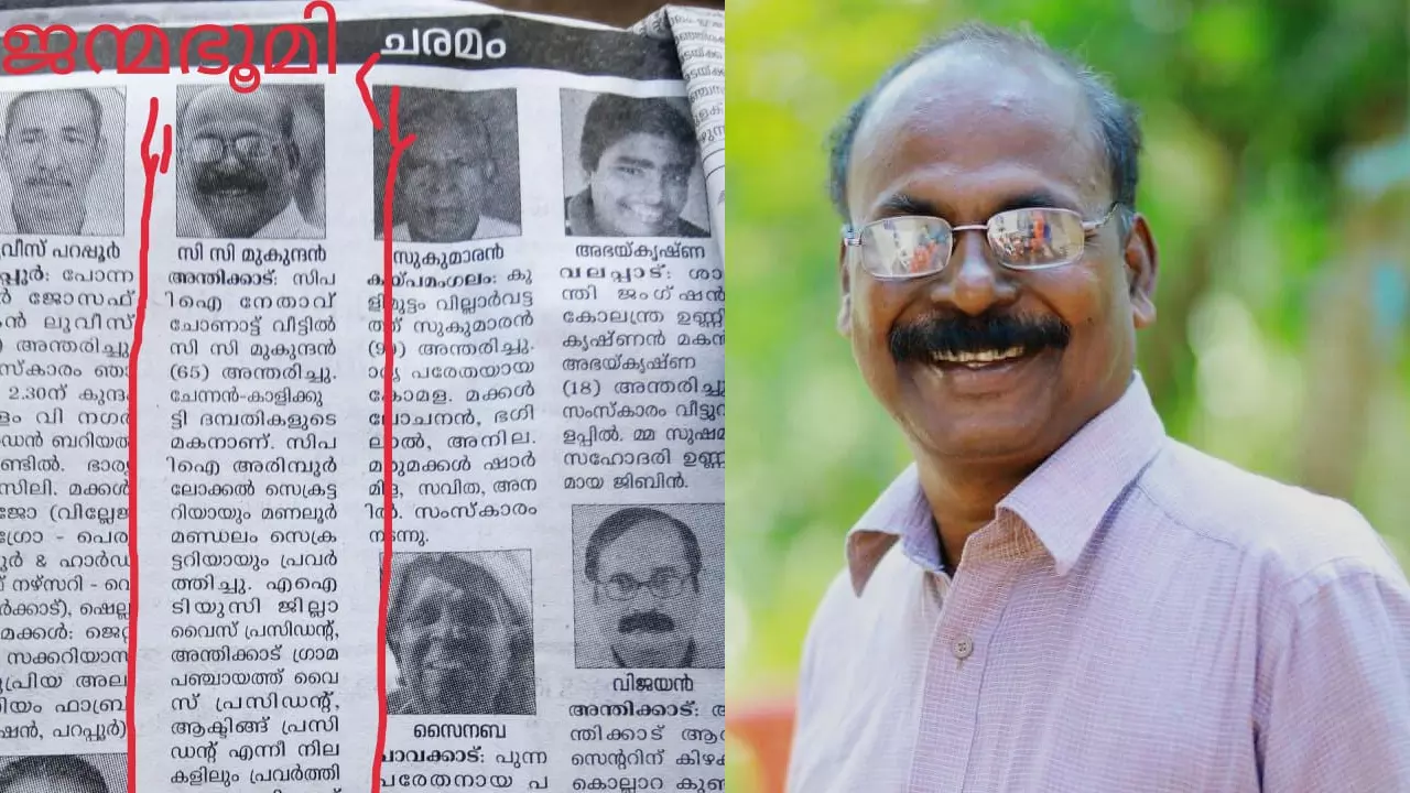 സി.സി മുകുന്ദന്റെ ചരമവാര്ത്ത ജന്മഭൂമി പത്രം പ്രസിദ്ധീകരിച്ചത് മനുഷ്യത്വവിരുദ്ധവും അപമാനകരവുമാണെന്ന് കെ.കെ വത്സരാജ് പ്രസ്താവനയില് പറഞ്ഞു. ജന്മഭൂമി പത്രം മാത്രം സഖാവ് മുകുന്ദന്റെ ബയോഡാറ്റ ചരമകോളത്തില് പ്രസിദ്ധീകരിച്ചത് പാര്ട്ടിയെ മാത്രമല്ല, നാട്ടിക നിയോജക മണ്ഡലത്തിലെ ജനങ്ങളെയാകെ അപമാനിച്ചതിന് തുല്യമാണ്. നാട്ടികയില് തെരഞ്ഞെടുപ്പിന് മുമ്പുതന്നെ പരാജയം മണത്ത ചില ആളുകള് ബോധപൂര്വ്വം ചമച്ചതാണോ ഈ വാര്ത്തയെന്ന് സംശയിക്കേണ്ടിയിരിക്കുന്നു. ജന്മഭൂമി പത്രം പ്രതിനിധാനം ചെയ്യുന്ന രാഷ്ട്രീയത്തിന്റെ സവര്ണ ഫാസിസ്റ്റ് മുഖമാണ് ഈ വ്യാജവാര്ത്തയിലൂടെ വെളിപ്പെട്ടിരിക്കുന്നത്. പട്ടികജാതി വിഭാഗത്തില് നിന്ന് ഒരു നേതാവ് തെരഞ്ഞെടുക്കപ്പെടുന്നതിലുള്ള അസഹിഷ്ണുതയുടെ ഭാഗമായാണ് ഇത്തരത്തില് വ്യാജവാര്ത്തകള് സൃഷ്ടിക്കുന്നത്. വ്യാജവാര്ത്ത ചമച്ച ജന്മഭൂമി പത്രത്തിനെതിരെ നിയമനടപടി സ്വീകരിക്കുന്നതിനാണ് കമ്മ്യൂണിസ്റ്റ് പാര്ട്ടി തീരുമാനിച്ചിട്ടുള്ളതെന്ന് അദ്ദേഹം പറഞ്ഞു.