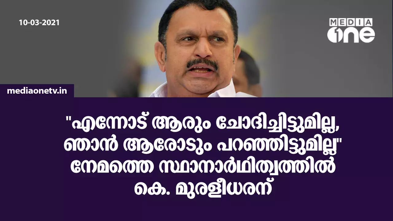 ''എന്നോട് ആരും ചോദിച്ചിട്ടുമില്ല, ഞാന് ആരോടും പറഞ്ഞിട്ടുമില്ല'' നേമത്തെ സ്ഥാനാര്ഥിത്വത്തില് കെ. മുരളീധരന്