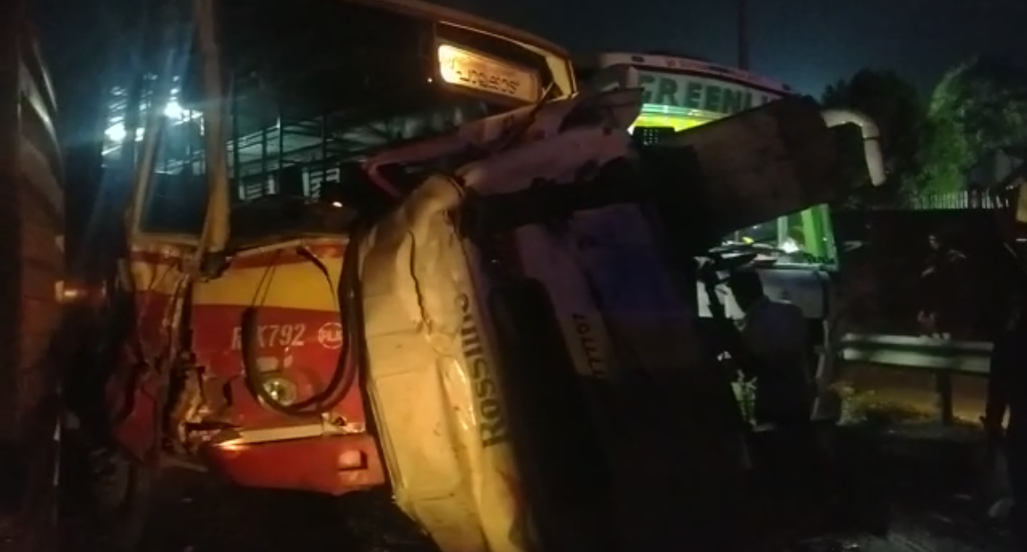 കെ.എസ്.ആർ.ടി.സി ബസിലും ടൂറിസ്റ്റ് ബസിലും ഇടിച്ച ശേഷമാണ് വാഹനം മറിഞ്ഞത്