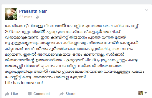 പ്രതീക്ഷിച്ച സ്ഥലം മാറ്റം, അസ്വാഭാവികമായി ഒന്നും കാണുന്നില്ലെന്ന് എന് പ്രശാന്ത്