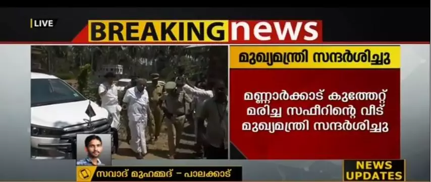 മണ്ണാര്ക്കാട് കുത്തേറ്റ് മരിച്ച ലീഗ് പ്രവര്ത്തകന് സഫീറിന്റെ വീട് മുഖ്യമന്ത്രി സന്ദര്ശിച്ചു. അട്ടപ്പാടിയില് നിന്ന് മടങ്ങുമ്പോഴാണ് മുഖ്യമന്ത്രി മണ്ണാര്ക്കാട്ടെത്തിയത്.
