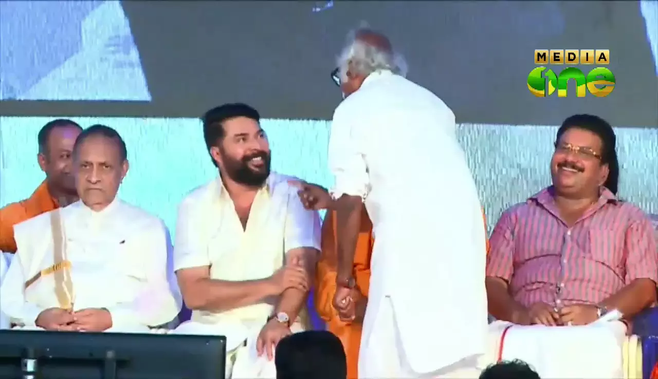 ശാന്തിഗിരി ആശ്രമത്തിലെ നവതി ആഘോഷങ്ങളുടെ ഭാഗമായുള്ള നവതി പുരസ്കാരം കരിക്കാനെത്തിയതായിരുന്നു മമ്മൂട്ടി. മന്ത്രി കടന്നപ്പളളി രാമചന്ദ്രനായിരുന്നു പരിപാടിയുടെ അധ്യക്ഷന്. മമ്മൂട്ടിയെ താന് ചേട്ടനെന്നാണ് വിളിക്കുന്നതെന്ന് പ്രസംഗത്തിനിടെ കടന്നപ്പളളി.