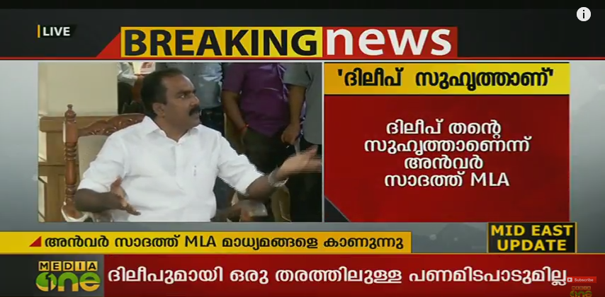 ദിലീപ് സുഹൃത്താണ്, പണമിടപാടില്ല: തെറ്റ് ചെയ്തിട്ടുണ്ടെങ്കില് ശിക്ഷിക്കണം: അന്വര് സാദത്ത് എംഎല്എ