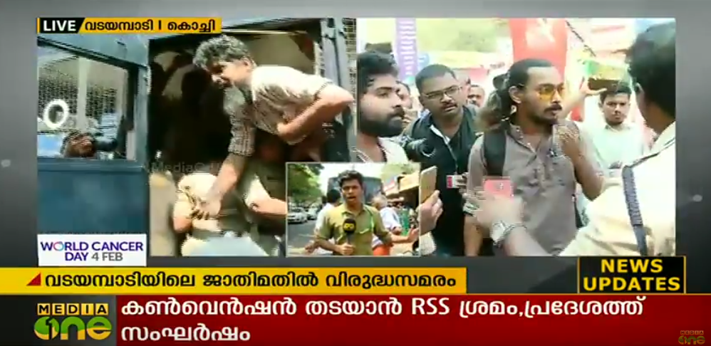 കണ്വെന്ഷന് തടയാന് എത്തിയ ആര്എസ്എസ് പ്രവര്ത്തകര് മാധ്യമപ്രവര്ത്തകരേയും കയ്യേറ്റം ചെയ്തു. ആക്രമണം നടത്തിയ ആര്എസ്എസുകാരെ അറസ്റ്റ് ചെയ്യാന് പൊലീസ് തയ്യാറാകുന്നില്ല..