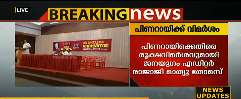 മുഖ്യമന്ത്രി പിണറായി വിജയനെ കടന്നാക്രമിക്കുന്ന പ്രസംഗമാണ് ജനയുഗം എഡിറ്റർ രാജാജി മാത്യു തോമസ് നടത്തിയത്. കൊച്ചിയിൽ സി.പി.ഐ സംഘടിപ്പിച്ച മാധ്യമ സെമിനാറിൽ സംസാരിക്കുകയായിരുന്നു അദ്ദേഹം. മാധ്യമങ്ങൾക്ക് മുഖ്യമന്ത്രി മുഖം നൽകാത്തത് വിമര്ശനങ്ങള് ഭയന്നാണെന്ന് രാജാജി മാത്യു കുറ്റപ്പെടുത്തി. സമൂഹ മാധ്യമങ്ങളിൽ കൂടിയുള്ള ഇടപെടലുകളിൽ മാത്രമൊതുങ്ങുകയാണ് മുഖ്യമന്ത്രി.