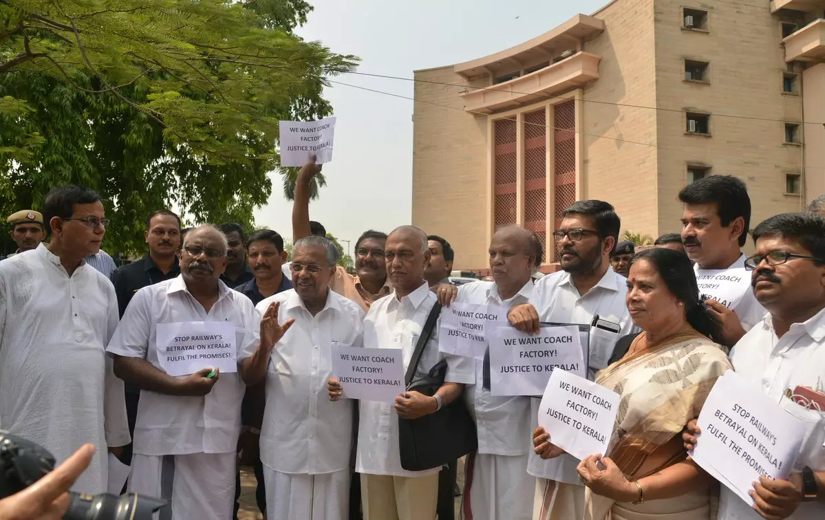 എം ബി രാജേഷ് എം പിയുടെ നേതൃത്വത്തിലാണ് റെയില്ഭവന് മുന്പില് പ്രതിഷേധം സമരം സംഘടിപ്പിച്ചത്. കേരളത്തോട് നീതി കാണിക്കണമെന്ന് ആവശ്യപ്പെട്ടുകൊണ്ടുള്ള പോസ്റ്ററുകള് ഉയര്ത്തിപ്പിടിച്ച്കൊണ്ടായിരുന്നു പ്രതിഷേധം. മുന്പ് യുപിഎ സര്ക്കാര് സ്വീകരിച്ച അതേ നിലപാടാണ് എന്ഡിഎയും സ്വീകരിക്കുന്നതെന്ന് പ്രതിഷേധസമരം ഉദ്ഘാടനം ചെയ്ത് കൊണ്ട് മുഖ്യമന്ത്രി പിണറായി വിജയന് പറഞ്ഞു. കേരളത്തിലേക്ക് കോച്ച് ഫാക്ടറി നല്കേണ്ടെന്നേ കേന്ദ്രസര്ക്കാരിനുള്ളു. ഹരിയാനയിലും ഉത്തര്പ്രദേശിലും പുതിയതായി കോച്ച് ഫാക്ടറി അനുവദിക്കുന്നതില് സര്ക്കാരിന് പ്രയാസമില്ലെന്നും പിണറായി വിജയന് കുറ്റപ്പെടുത്തി.