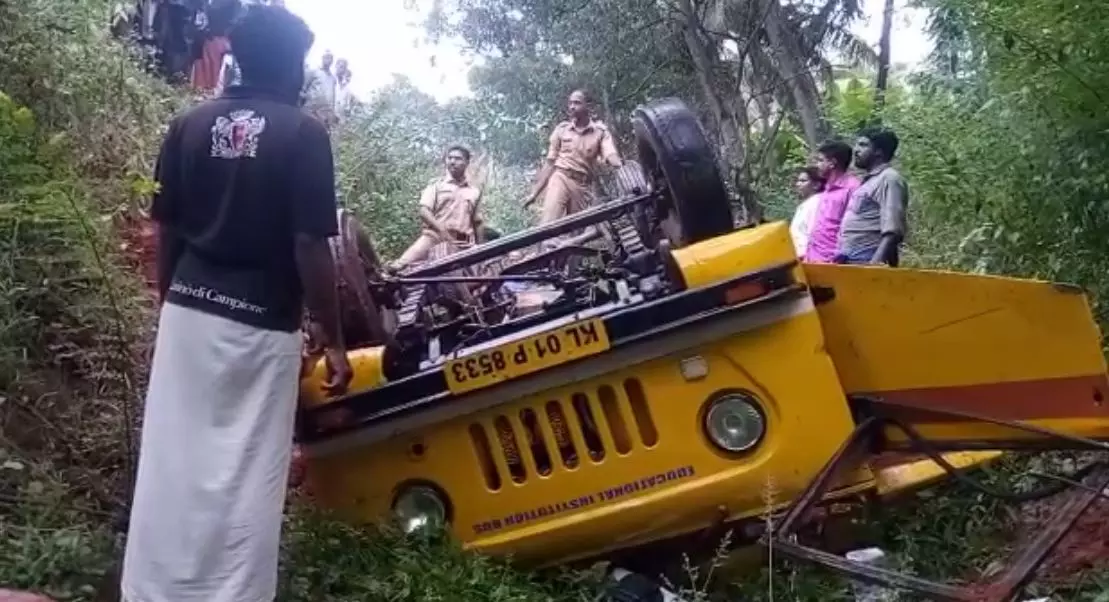 രാവിലെ എട്ടുമണിയോടെയാണ് അപകടമുണ്ടായത്. ബസിലുണ്ടായിരുന്ന പന്ത്രണ്ട് കുട്ടികള്ക്കും ഡ്രൈവര്ക്കും അപകടത്തില് പരിക്കേറ്റിട്ടുണ്ട്
