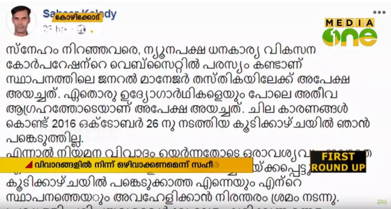 മന്ത്രി ഉള്പ്പെടെ വിവാദങ്ങളിലേക്ക് വലിച്ചിഴച്ചതോടെയാണ് സഹീര് ഫേസ് ബുക്കില് നിലപാട് വ്യക്തമാക്കിയത്. ന്യൂനപക്ഷ കോര്പ്പറേഷന് പരസ്യം കണ്ടാണ് അപേക്ഷ അയച്ചത്. എന്നാല് അഭിമുഖത്തില് പങ്കെടുക്കാന് കഴിഞ്ഞില്ല. അഭിമുഖത്തില് പങ്കെടുക്കാത്ത തന്നെയും താന് ജോലി ചെയ്യുന്ന സ്ഥാപനത്തെയും ഒരാവശ്യവുമില്ലാതെ വിവാദങ്ങളിലേക്ക് വലിച്ചിഴക്കുന്നു. പ്രവൃത്തിപരിചയം ഉള്ളവര്ക്ക്മാത്രം നല്കുന്ന എക്സിക്യൂട്ടീവ് എം.ബി.എ നിലവാരമില്ലാത്ത വെറും വിദൂര വിദ്യാഭ്യാസ യോഗ്യതയായി മാറി. ഇപ്പോള് 38 വയസ്സായി. ഇനിയും മെറിറ്റിലൂടെ പുതിയ തൊഴിലവസരങ്ങള്ക്കായുള്ള എഴുത്ത് പരീക്ഷകളിലും ഇന്റര്വ്യൂകളിലും പങ്കെടുക്കും. വിവാദങ്ങളിലേക്ക് വലിച്ചിഴക്കരുതെന്ന അപേക്ഷയോടെയാണ് പോസ്റ്റ് അവസാനിപ്പിക്കുന്നത്.