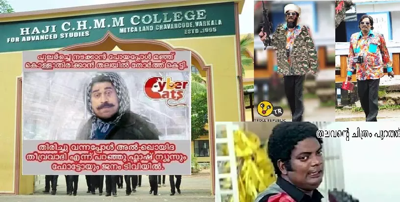കേരളത്തിൽ അൽഖ്വയ്ദ പിടിമുറുക്കുന്നുവെന്ന 'ജനം' ടി.വിയുടെ വ്യാജ വാര്ത്തയെ ട്രോളി നിലം പരിശാക്കി സോഷ്യല് മീഡിയ. ചാവർകോട് സി.എച്ച്.എം.എം കോളജിൽ തീവ്രവാദ പ്രവർത്തനമുണ്ടെന്ന വാസ്തവ വിരുദ്ധ പ്രചാരണം നടത്തിയ ജനം ടി.വിക്കെതിരെയാണ് ട്രോളന്മാര് പരിഹാസവുമായി രംഗത്ത് വന്നത്. ആന്വല് ഡേക്ക് മുഖ്യാതിഥിയായി പങ്കെടുത്ത സലീം കുമാറിന്റെ തന്നെ സി.ഐ.ഡി മൂസ എന്ന സിനിമയുടെ തീമില് അണിയിച്ചൊരുക്കിയ ഡ്രസ് കോഡിനെയാണ് ജനം ടി.വി വ്യാജ വാര്ത്ത പടച്ചു വിട്ടത്. ഇതിനെതിരെ സലീം കുമാറിന്റെ തന്നെ കഥാപാത്രങ്ങളെ വെച്ചാണ് ട്രോളന്മാര് അണിനിരന്നത്.