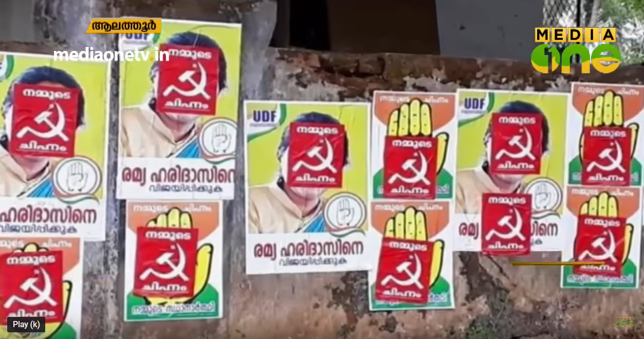 പാട്ടു ചര്ച്ചകള്ക്ക് ശേഷം ആലത്തൂരിലെ ഇപ്പോഴത്തെ പ്രധാന ചര്ച്ച പോസ്റ്റര് വിവാദമാണ്. യു.ഡി.എഫ് സ്ഥാനാര്ഥി രമ്യാ ഹരിദാസിന്റെ പോസ്റ്ററുകള്ക്ക് മേല് വ്യാപകമായി എല്.ഡി.എഫ് ചിഹ്നം പതിച്ചെന്നാണ് ആരോപണം. സോഷ്യല് മീഡിയയില് ഇത് വലിയ ചര്ച്ചയായിക്കഴിഞ്ഞു.