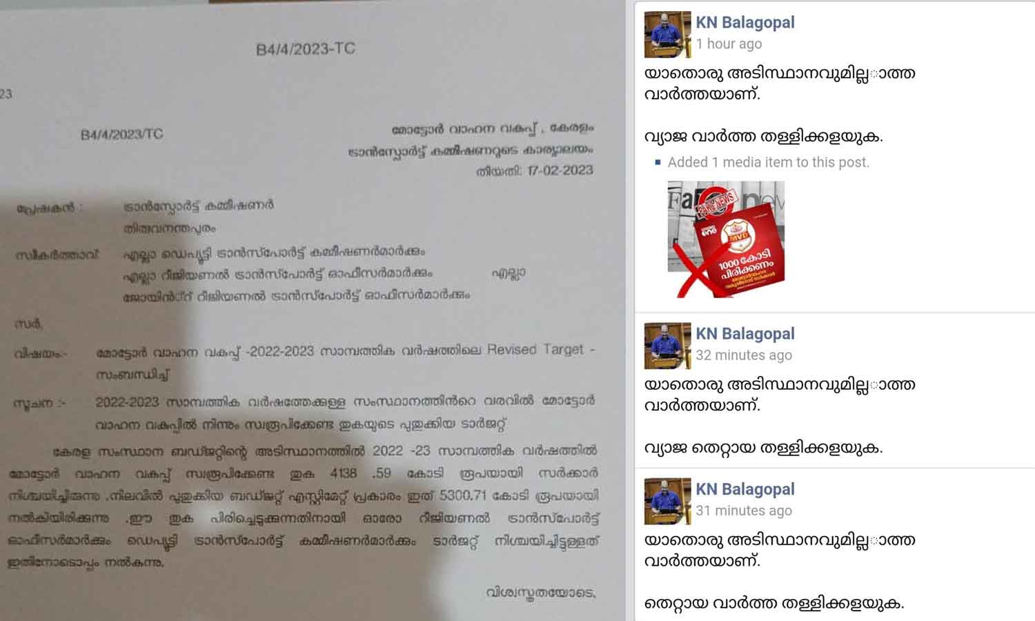 കോഴിക്കോട്: ഗതാഗത നിയമലംഘനങ്ങൾക്ക് പിഴയായി ഈ വർഷം 1000 കോടി രൂപ പിരിക്കണമെന്ന് മോട്ടോർ വാഹന വകുപ്പിന് നിർദേശം നൽകിയെന്ന വാർത്ത സംബന്ധിച്ച നിലപാടിൽ മലക്കംമറിഞ്ഞ് ധനകാര്യമന്ത്രി കെ.എൻ ബാലഗോപാൽ. മീഡിയവൺ റിപ്പോർട്ടിന്റെ കാർഡ് പങ്കുവെച്ചുകൊണ്ട് 'യാതൊരു അടിസ്ഥാനവുമില്ലാത്ത വാർത്ത, വ്യാജ വാർത്ത തള്ളിക്കളയുക' എന്നാണ് ആദ്യം ധനകാര്യമന്ത്രി ഫേസ്ബുക്ക് പോസ്റ്റിട്ടത്. പിന്നീട് ഇത് സംബന്ധിച്ച സർക്കുലർ പുറത്തുവിട്ടതോടെ 'യാതൊരു അടിസ്ഥാനവുമില്ലാത്ത വാർത്തയാണ്, തെറ്റായ വാർത്ത തള്ളിക്കളയുക' എന്ന് തിരുത്തുകയായിരുന്നു.