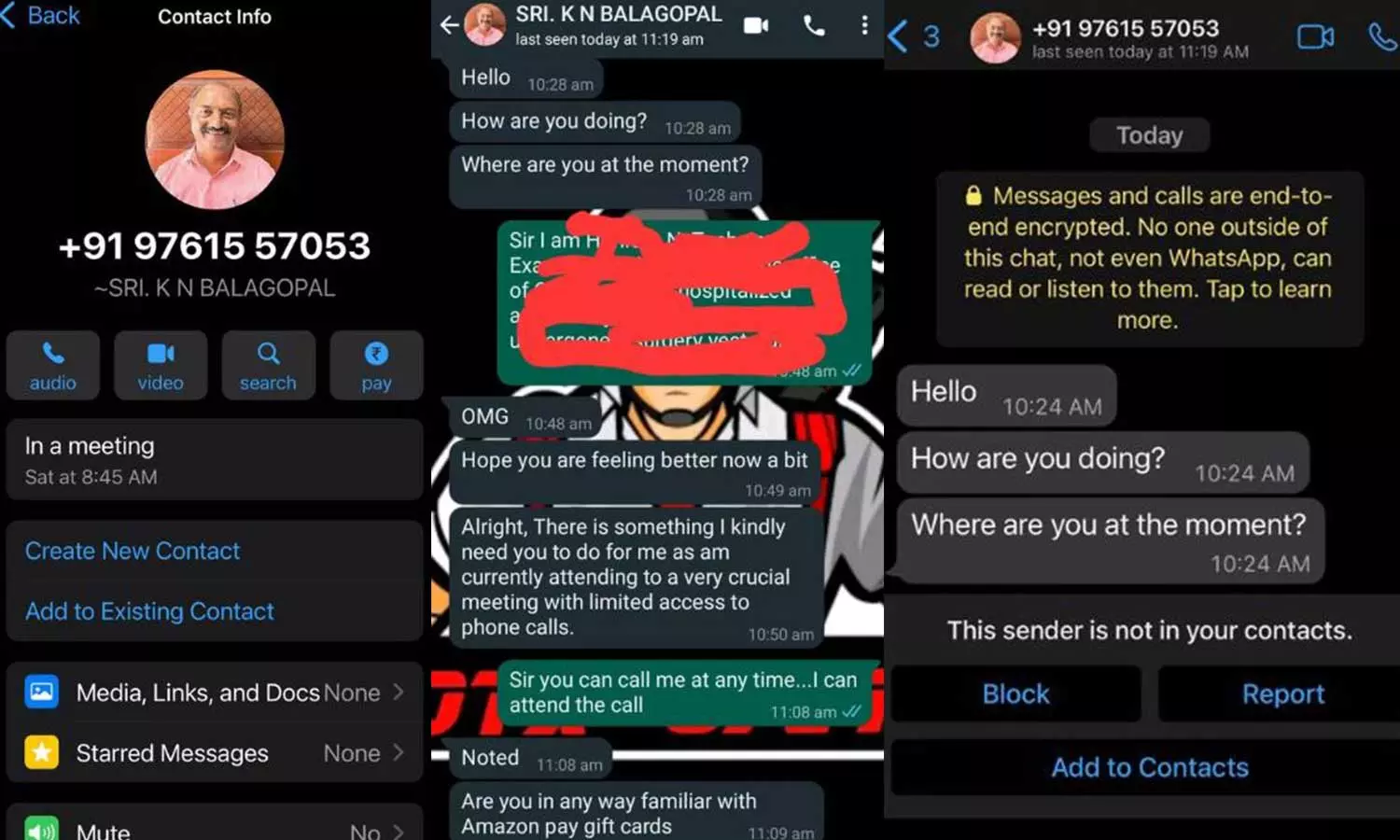 നേരത്തെ മുഖ്യമന്ത്രി പിണറായി വിജയൻ, സ്പീക്കർ എം.ബി രാജേഷ്, ഡി.ജി.പി അനിൽ കാന്ത് എന്നിവരുടെ പേരിലും സമാനമായ രീതിയിൽ വാട്സ്ആപ്പ് തട്ടിപ്പ് നടന്നിരുന്നു