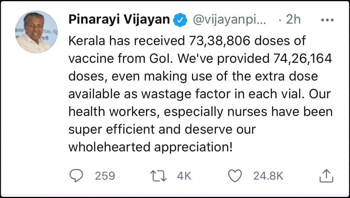 "73.38 ലക്ഷം ഡോസ് കിട്ടിയ കേരളം, 74.26 ലക്ഷം ഡോസ് വാക്സിൻ കൊടുത്തത്രെ, കണക്കുകൾ ഒന്നും ശരിയാകുന്നില്ലല്ലോ പിണറായീ ... "...