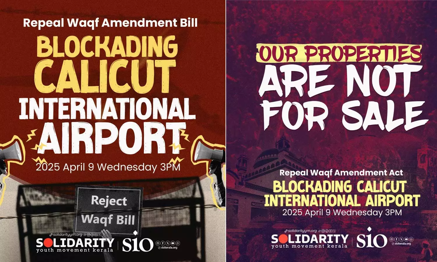 കോഴിക്കോട്: മുസ്ലിം വംശഹത്യക്ക് കളമൊരുക്കുന്ന വഖഫ് ഭേദഗതി നിയമം പിൻവലിക്കുക എന്ന ആവശ്യമുന്നയിച്ചു സോളിഡാരിറ്റി, എസ്ഐഒ സംസ്ഥാന കമ്മിറ്റിയുടെ നേതൃത്വത്തിൽ നടക്കുന്ന കോഴിക്കോട് അന്താരാഷ്ട്ര വിമാനത്താവളം ഉപരോധം നാളെ. ബുധനാഴ്ച വൈകീട്ട് മൂന്ന് മുതലാണ് ഉപരോധം.