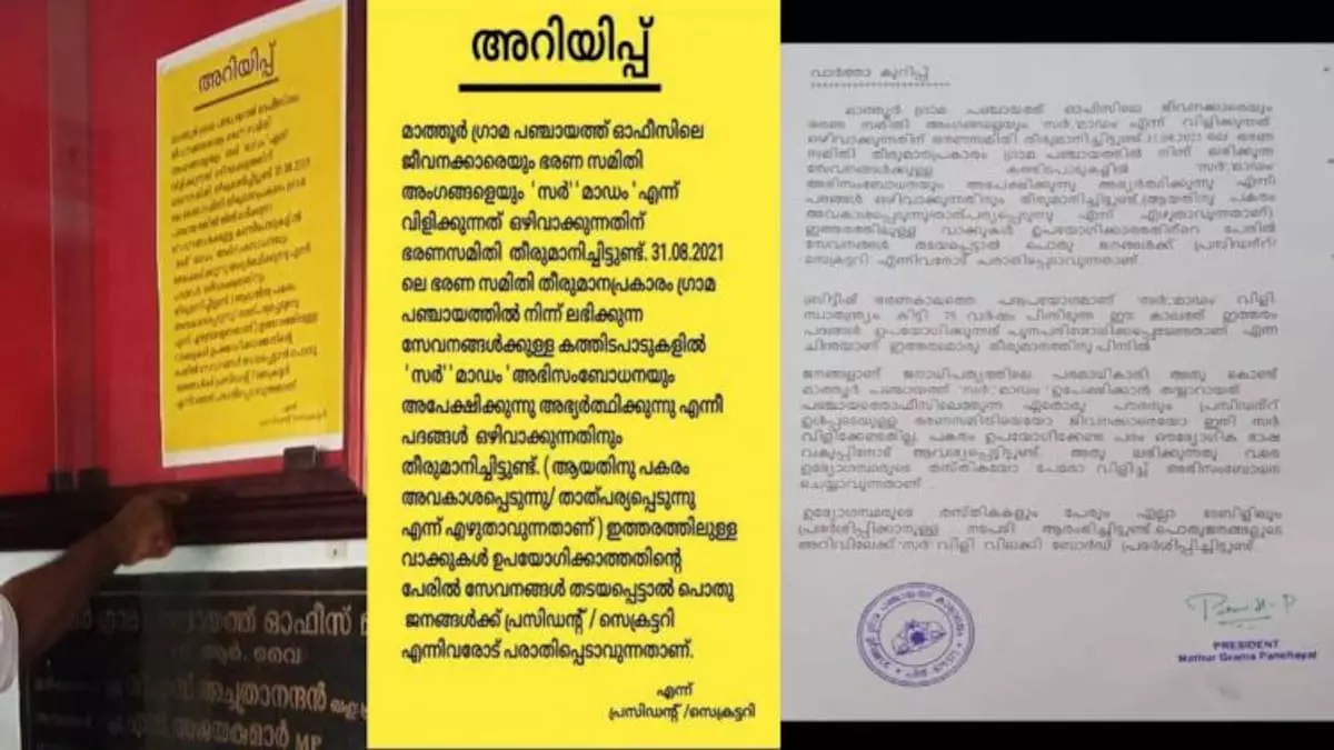 പഞ്ചായത്ത് ഓഫീസിലെത്തുന്ന ഏതൊരു പൗരനും പ്രസിഡന്റ് ഉള്പ്പടെയുള്ള ഭരണസമിതിയെയോ ജീവനക്കാരെയോ ഇനി സര് വിളിക്കേണ്ടതില്ല. പകരം ഉപയോഗിക്കേണ്ട പദം ഔദ്യോഗിക ഭാഷ വകുപ്പിനോട് ആവശ്യപ്പെട്ടിട്ടുണ്ട്. അതു ലഭിക്കുന്നതു വരെ ഉദ്യോഗസ്ഥരുടെ തസ്തികയോ പേരോ വിളിച്ച് അഭിസംബോധന ചെയ്യാവുന്നതാണ്. ഉദ്യോഗസ്ഥരുടെ തസ്തികകളും പേരും എല്ലാ ടേബിളിലും പ്രദര്ശിപ്പിക്കാനുള്ള നടപടി ആരംഭിച്ചിട്ടുണ്ട്. പൊതുജനങ്ങളുടെ അറിവിലേക്ക് തീരുമാനം വ്യക്തമാക്കി ബോര്ഡ് പ്രദര്ശിപ്പിച്ചിട്ടുണ്ടെന്നും ഭരണ സമിതി വ്യക്തമാക്കുന്നു.
