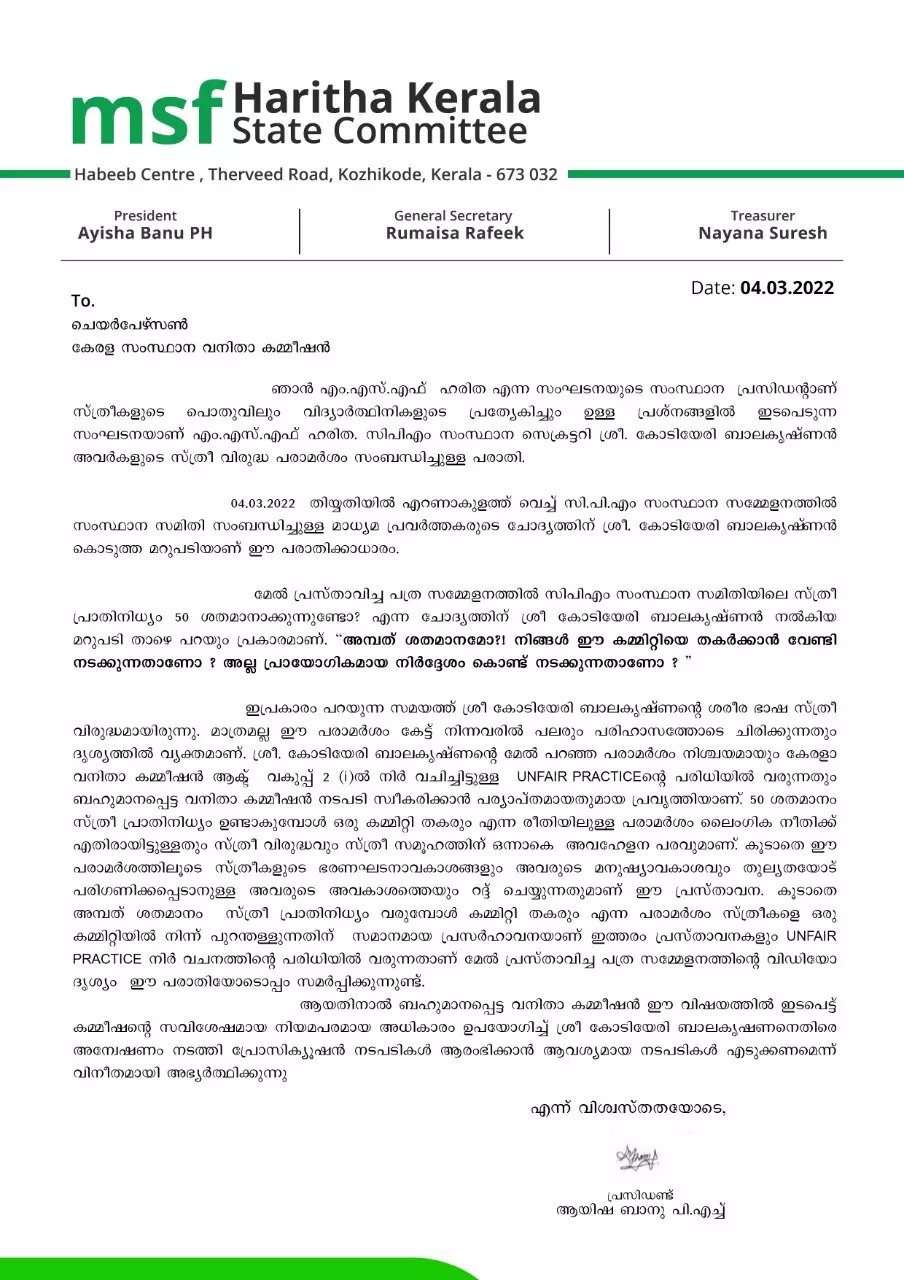 കോടിയേരി ബാലകൃഷ്ണന്റെ സ്ത്രീ വിരുദ്ധ പരാമർശത്തിനെതിരെ നേരത്തെ എംഎസ്എഫ് മുൻ ദേശീയ വൈസ് പ്രസിഡൻറ് അഡ്വ. ഫാത്തിമ തഹിലിയയും വനിതാ കമ്മീഷനിൽ പരാതി നൽകിയിരുന്നു