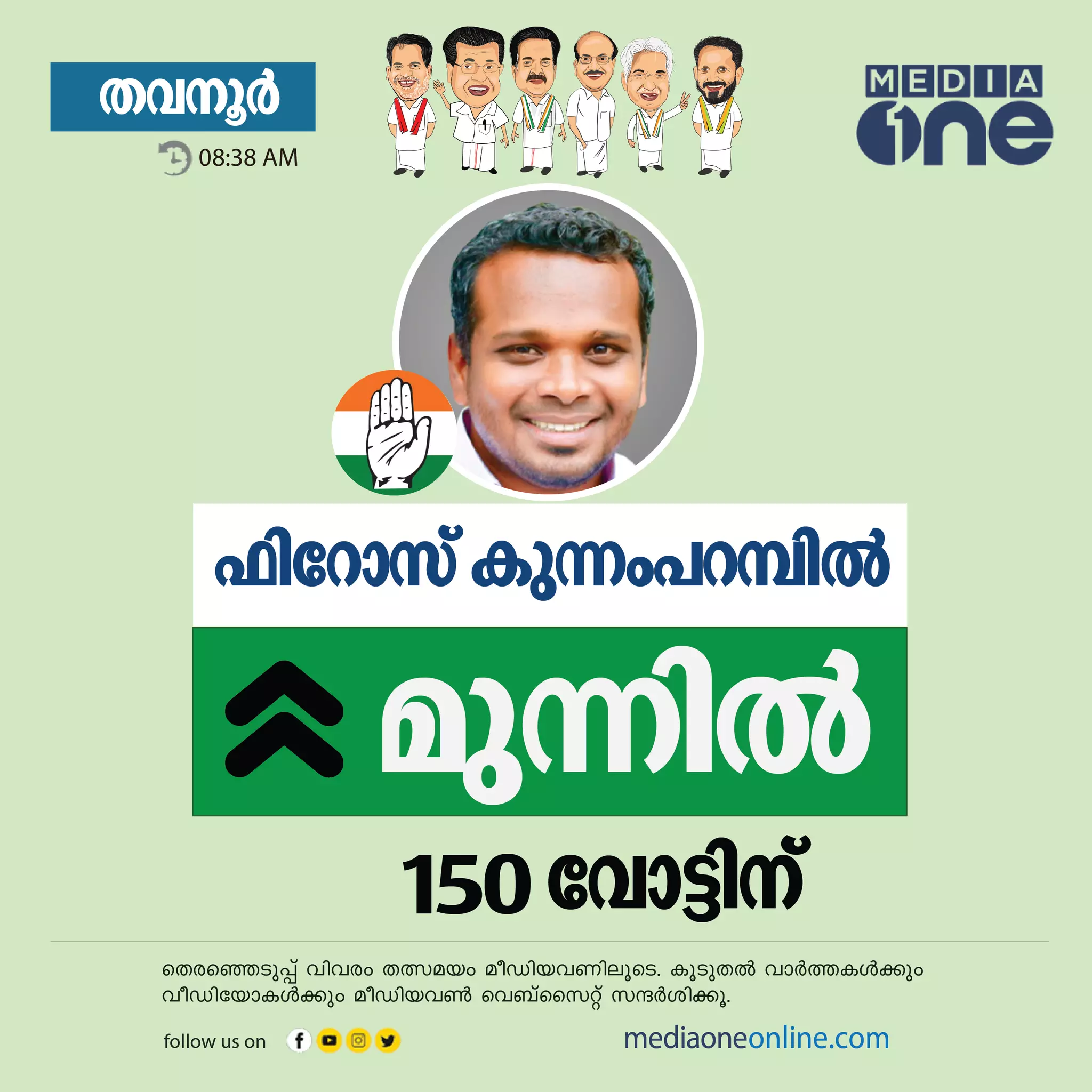 തവന്നൂരില് യുഡിഎഫ് സ്ഥാനാര്ത്ഥി ഫിറോസ് കുന്നുംപറമ്പിൽ 150 വോട്ടുകൾക്ക് മുന്നിൽ