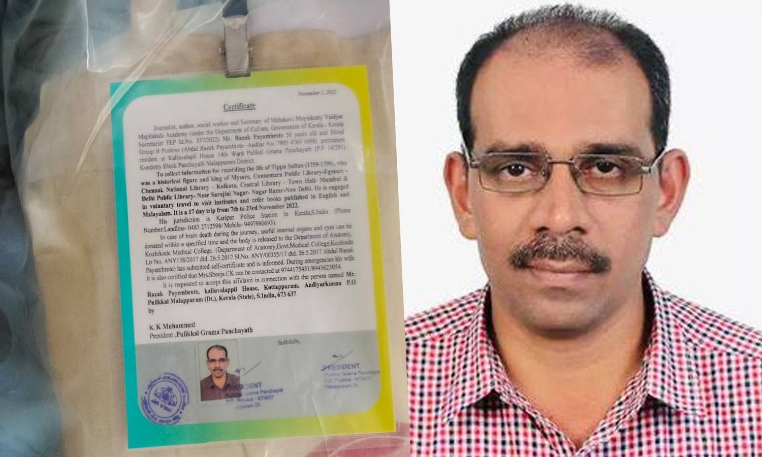 റസാഖ് കഴുത്തിൽ തൂക്കിയിട്ടിരുന്ന, പരാതികളും രേഖകളും അടങ്ങിയ കാർഡ്