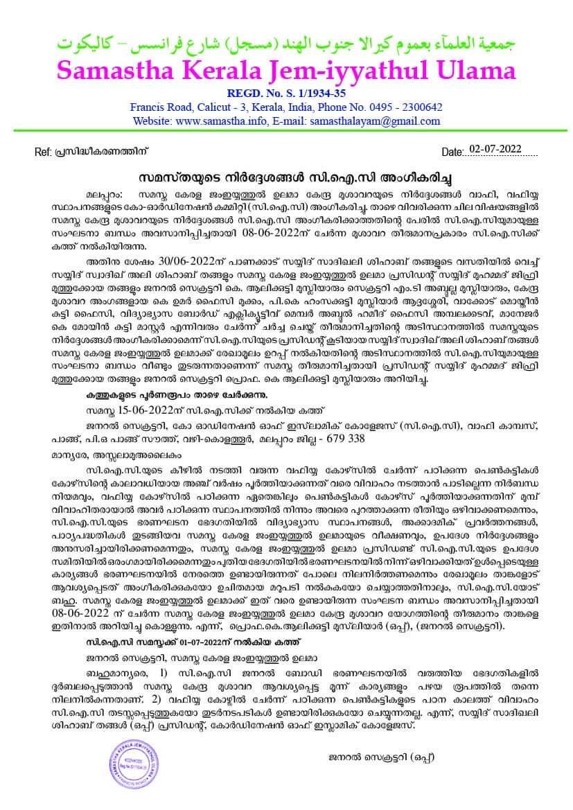 കോഴ്സ് കഴിയുന്നതിന് മുമ്പ് വിവാഹം; സിഐസി നിർദേശങ്ങൾ അംഗീകരിച്ചതായി സമസ്ത