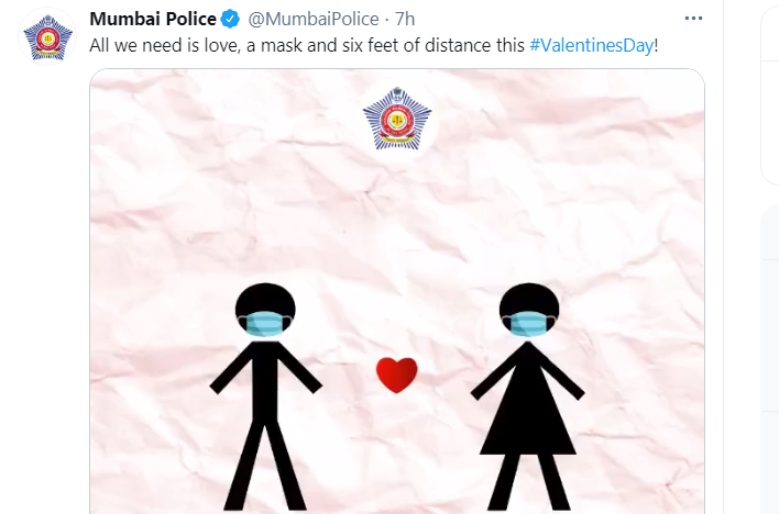 'ദൂരം പ്രണയത്തെ കൂടുതൽ ശക്തമാക്കുന്നു, നമുക്ക് വേണ്ടത് സ്നേഹവും മാസ്കും' പ്രണയദിനത്തില് മുംബൈ പൊലീസിന്റെ ട്വീറ്റ്
