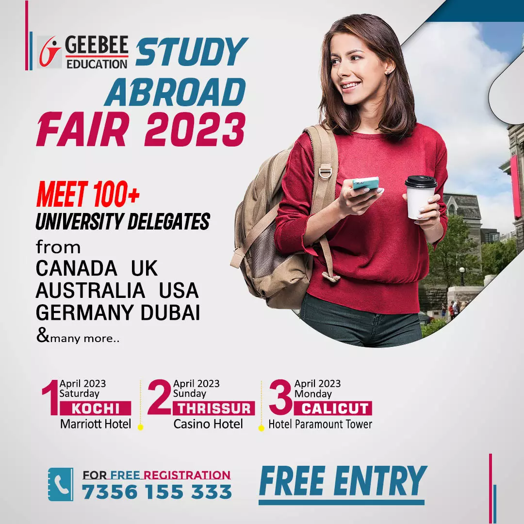 ഏപ്രില് ഒന്ന്, രണ്ട്, മൂന്ന് തീയതികളിലായി കൊച്ചിയിലും തൃശൂരും കോഴിക്കോടും ആണ് ഫെയര് നടക്കുന്നത്. ഏപ്രില് ഒന്ന് ശനി എടപ്പള്ളി മാരിയറ്റ് ഹോട്ടലിലും ഏപ്രില് രണ്ട് ഞായര് തൃശൂര് കാസിനോ ഹോട്ടലിലും ഏപ്രില് മൂന്ന് തിങ്കള് കോഴിക്കോട് പാരമൗണ്ട് ടവറിലുമായാണ് ഈ സ്റ്റഡ് അബ്രോഡ് ഫെയര്. പതിനഞ്ച് രാജ്യങ്ങള്, നൂറിന് മുകളില് വിദേശസര്വകലാശാല പ്രതിനിധികള്- ഇന്ത്യയിലെ തന്നെ ഏറ്റവും വലിയ സ്റ്റഡി എബ്രോഡ് ഫെയറിനാണ് കേരളം ഈ ദിവസങ്ങളില് ആതിഥ്യമരുളുന്നത്. സ്റ്റഡി അബ്രോഡ് കണ്സള്ട്ടിംഗ് രംഗത്ത് 20ലേറെ വര്ഷത്തെ പാരമ്പര്യമുള്ള Geebee educationനാണ് ഈ ഫെയറിന്റെ സംഘാടകര്.