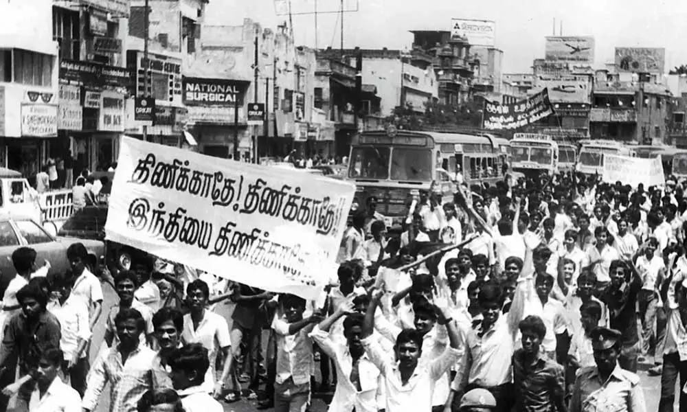 കൊളോണിയലിസവുമായി ഇംഗ്ലീഷിന് അഭേദ്യമായ ബന്ധമുണ്ടെന്ന കാഴ്ചപ്പാട് ഹിന്ദുത്വത്തിന് മുമ്പുള്ളതാണ്. സൗകര്യപൂർവ്വം വിസ്മരിക്കപ്പെടുന്നത് എന്തെന്നാൽ ഹിന്ദി ഇംഗ്ലീഷിനേക്കാൾ തമിഴ് ഭൂപ്രകൃതിയിലേക്ക് പിന്നീട് വന്ന ഒന്നാണ്, ഒരു വിധത്തിൽ വൈദേശികമായും കടന്നു വന്ന ഒന്നാണ് ഹിന്ദി. 1938 ൽ മദ്രാസ് പ്രസിഡൻസിയുടെ പ്രധാനമന്ത്രിയായി ഹിന്ദി അടിച്ചേൽപ്പിച്ച തമിഴ് ബ്രാഹ്മണ കോൺഗ്രസ് നേതാവ് സി. രാജഗോപാലാചാരി (ജനപ്രിയമായി, രാജാജി) പോലും അടിത്തട്ടിലെ സ്ഥിതിഗതികൾ മനസ്സിലാക്കാൻ മാത്രം ചിന്തയുള്ള ആളായിരുന്നു . മൂന്ന് പതിറ്റാണ്ടിനുള്ളിൽ അദ്ദേഹം യു-ടേൺ എടുത്തിരുന്നു. 1960 കളിൽ അദ്ദേഹം ഹിന്ദി അടിച്ചേൽപ്പിക്കലിനെ ശക്തമായി എതിർക്കുകയും "ഇംഗ്ലീഷ് എവർ, ഹിന്ദി നെവർ" എന്ന് പ്രഖ്യാപിക്കുകയും ചെയ്തു. ഇംഗ്ലീഷിൽ നിന്ന് ഒരു ബോഗിമാനെ സൃഷ്ടിക്കുന്നത് സമ്പൂർണ്ണ ഹിന്ദി അടിച്ചേൽപ്പിക്കാനുള്ള ജനങ്ങളുടെ ഭയം വർദ്ധിപ്പിക്കുകയേ ഉള്ളൂ. സംസ്ഥാനത്തെ ഭാഷാ രാഷ്ട്രീയത്തെക്കുറിച്ചുള്ള തന്റെ പഠനത്തിൽ, സുമതി രാമസ്വാമി എഴുതുന്നു, "ഹിന്ദി വിരുദ്ധ പ്രതിഷേധങ്ങളുടെ ഈ തിരമാലകൾ ആധുനിക തമിഴ്നാട്ടിലെ കക്ഷിരാഷ്ട്രീയത്തിന്റെ രൂപരേഖകളെ വിമർശനാത്മകമായി രൂപപ്പെടുത്തി, ബ്രിട്ടീഷുകാർക്കെതിരായ കൊളോണിയൽ വിരുദ്ധ പ്രക്ഷോഭങ്ങളേക്കാൾ കൂടുതൽ. ഇത് ഓർക്കേണ്ട ഒരു പാഠമാണ്.