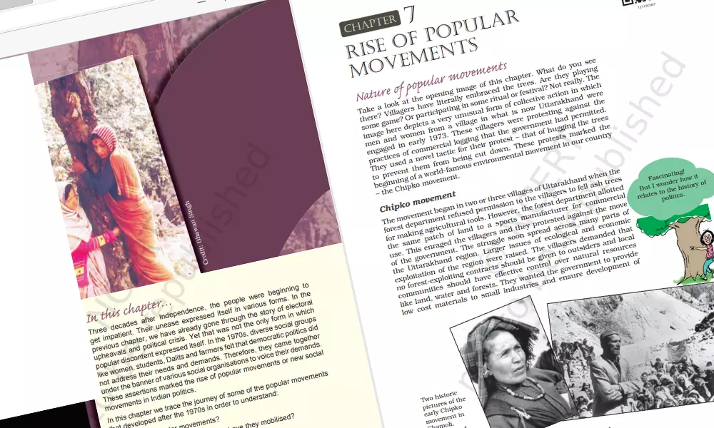 എഴുപതുകളില് മഹാരാഷ്ട്രയിലെ ദലിത് പാന്തേഴ്സിന്റെ വളര്ച്ച, 1970 കളിലെ ഉത്തരാഖണ്ഡിലെ ചിപ്കോ പ്രസ്ഥാനത്തിന്റെ യാത്ര, എണ്പതുകളിലെ കര്ഷക പോരാട്ടങ്ങള്, പ്രത്യേകിച്ച് ഭാരതിയ കിസാന് യൂണിയന്റെ നേതൃത്വത്തില് നടന്നത് - എന്നിവ ഈ അധ്യായത്തില് രേഖപ്പെടുത്തിയിരിക്കുന്നു. അന്ധ്രാപ്രദേശിലെ പുരാതന മദ്യ വിരുദ്ധ പ്രസ്ഥാനവും, മധ്യപ്രദേശിലെ നര്മദ നദിയിലെ സര്ദാര് സരോവര് പദ്ധതിക്കെതിരെ നടന്ന നര്മദാ ബചാവോ ആന്ദോളന്, ഗുജറാത്ത്, മഹാരാഷ്ട്ര, വിവര അവകാശത്തിനുള്ള പ്രക്ഷോഭങ്ങളും ഒഴിവാക്കിയ പാഠഭാഗങ്ങളില് ഉണ്ട്.