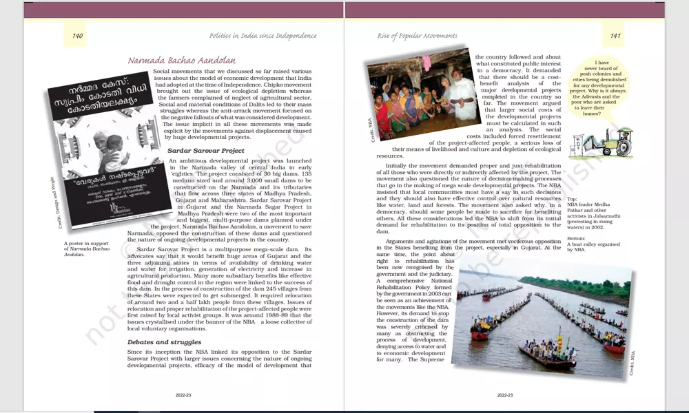 പത്താം ക്ലാസ്സിലെ പൊളിറ്റിക്കല് സയന്സ് പാഠപുസ്തകത്തില് (ഡെമോക്രാറ്റിക് പൊളിറ്റിക്സ് II) നിന്ന് ജനകീയ പോരാട്ടങ്ങളെക്കുറിച്ചുള്ള മൂന്നാമത്തെ അധ്യായം ഒഴിവാക്കി. സമ്മര്ദ ഗ്രൂപ്പുകളിലൂടെയും പ്രസ്ഥാനങ്ങളിലൂടെയും രാഷ്ട്രീയത്തെ സ്വാധീനിക്കാനുള്ള പരോക്ഷമായ മാര്ഗങ്ങളെ കുറിച്ച് പ്രതിപാദിക്കുന്നതാണ് ഇവ. നേപ്പാളിലെ ജനാധിപത്യത്തിനായുള്ള പ്രസ്ഥാനത്തിനും ബൊളീവിയയിലെ വെള്ളം സ്വകാര്യവല്ക്കരിക്കുന്നതിനെതിരായ പ്രതിഷേധത്തിനും പുറമെ, നര്മദ ബച്ചാവോ ആന്ദോളനെക്കുറിച്ചും, 1987 ല് കര്ണാടകയില് നടന്ന അഹിംസാത്മക കിറ്റിക്കോ - ഹാച്ചിക്കോ പ്രതിഷേധം, കാന്ഷി റാം സ്ഥാപിച്ച ബാക്വേഡ് ആന്ഡ് മൈനോറിറ്റി കമ്മ്യൂണിറ്റിസ് എംപ്ലോയീസ് ഫെഡറേഷന്, മേധപട്കര് സ്ഥാപക നേതാക്കളില് ഒരാളായ നാഷണല് അലയന്സ് ഫോര് പീപ്പിള്സ് മൂവ്മെന്റ്സ് എന്നിവയെക്കുറിച്ചായിരുന്നു ആ അധ്യായങ്ങളില് ഉണ്ടായിരുന്നത്.