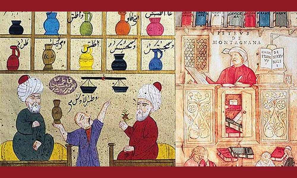 റോമിന്റെ പതനത്തിനുശേഷം വിജ്ഞാനം, സാഹിത്യം, വൈദ്യ ശാസ്ത്രം എന്നിവയുടെ പരിപോഷണം ബാഗ്ദാദിലെയും സ്പെയിനിലെയും ഡമാസ്കസിലെയും ഇസ്ലാമിക സാമ്രാജ്യങ്ങള് ഏറ്റെടുത്തു. ഇതുമൂലം ഔഷധ വിജ്ഞാനം, രസതന്ത്രം, ആസ്ട്രോണമി, ഫിസിക്സ്, ഒപ്റ്റിക്സ്, ജോമെട്രി, ഗണിത ശാസ്ത്രം എന്നിവയില് ധാരാളം കണ്ടുപിടിത്തങ്ങള് ഉണ്ടായി. | DaVelhaMedicina - ഭാഗം: 15