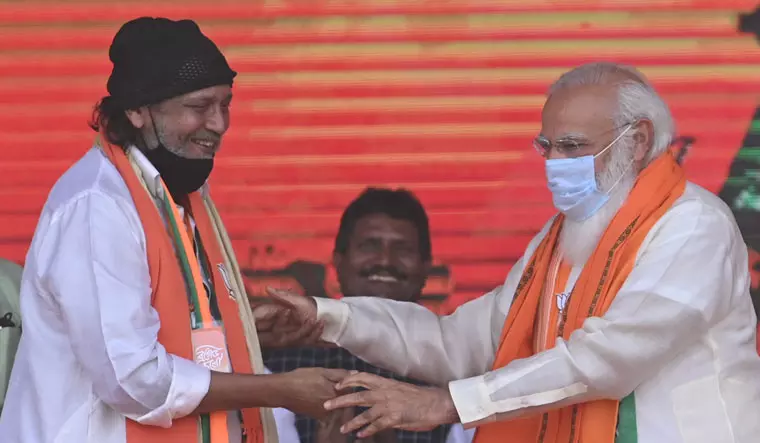 കൊൽക്കത്തയിലെ ബ്രിഗേഡ് പരേഡ് ഗ്രൗണ്ടിൽ പ്രധാനമന്ത്രി നരേന്ദ്ര മോദി പങ്കെടുത്ത ചടങ്ങിലാണ് 70കാരനായ മിഥുൻ ചക്രബർത്തി ബിജെപിയിൽ ചേർന്നത്. മോദിയെ വാനോളം പുകഴ്ത്തിയായിരുന്നു മിഥുന് ചക്രബര്ത്തി സംസാരം തുടങ്ങിയത്. മോദിയുമായി വേദി പങ്കിടാന് സാധിച്ചത് സ്വപ്ന തുല്യമായ കാര്യമാണ്. താനൊരു സ്വാഭിമാനിയായ ബംഗാളിയാണെന്നും അദ്ദേഹം പറഞ്ഞു. വേദിയില് വെച്ച് മിഥുന് ബിജെപി പതാക ഏറ്റുവാങ്ങി. തൃണമൂല് രാജ്യസഭ എം.പിയായിരുന്ന മിഥുന് ചക്രബര്ത്തി രണ്ട് വര്ഷത്തിനുള്ളില് സ്ഥാനം രാജിവെക്കുകയായിരുന്നു.